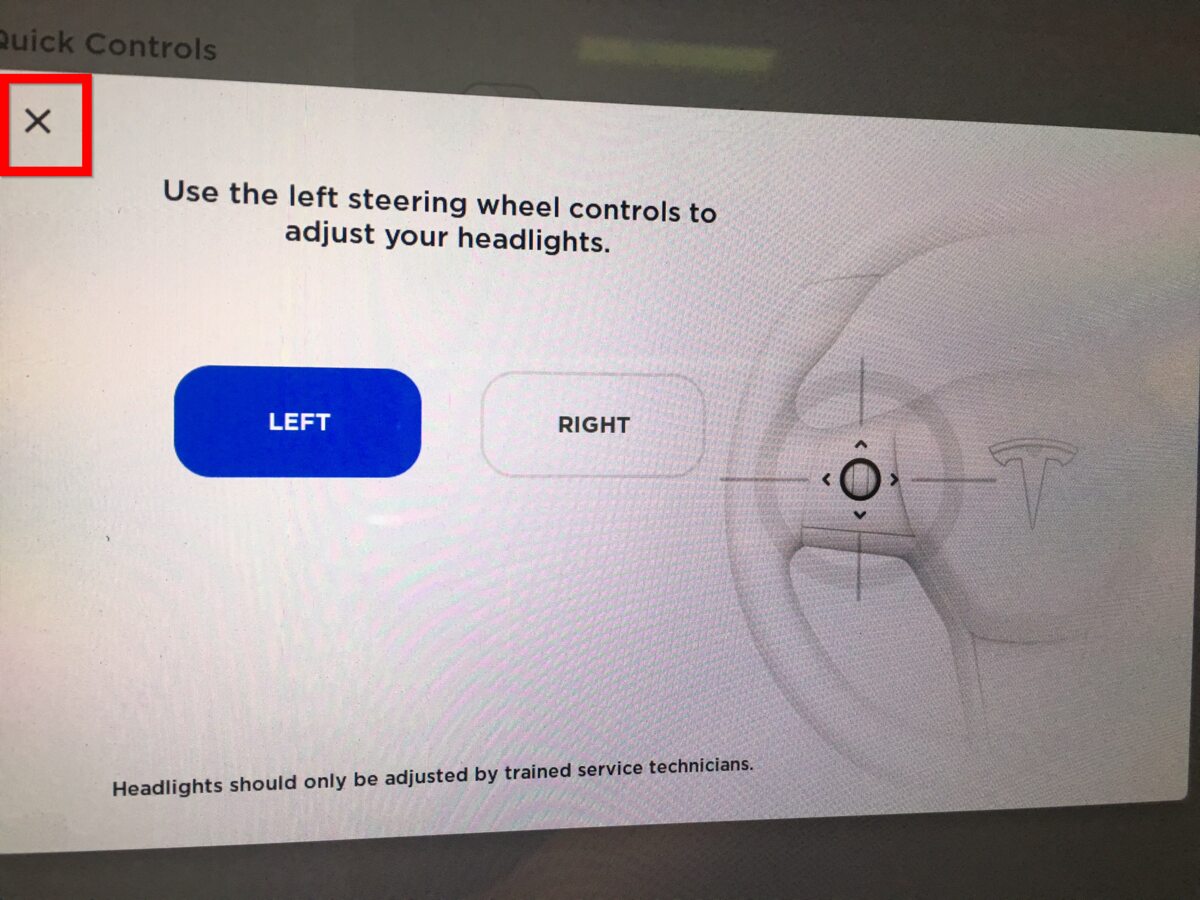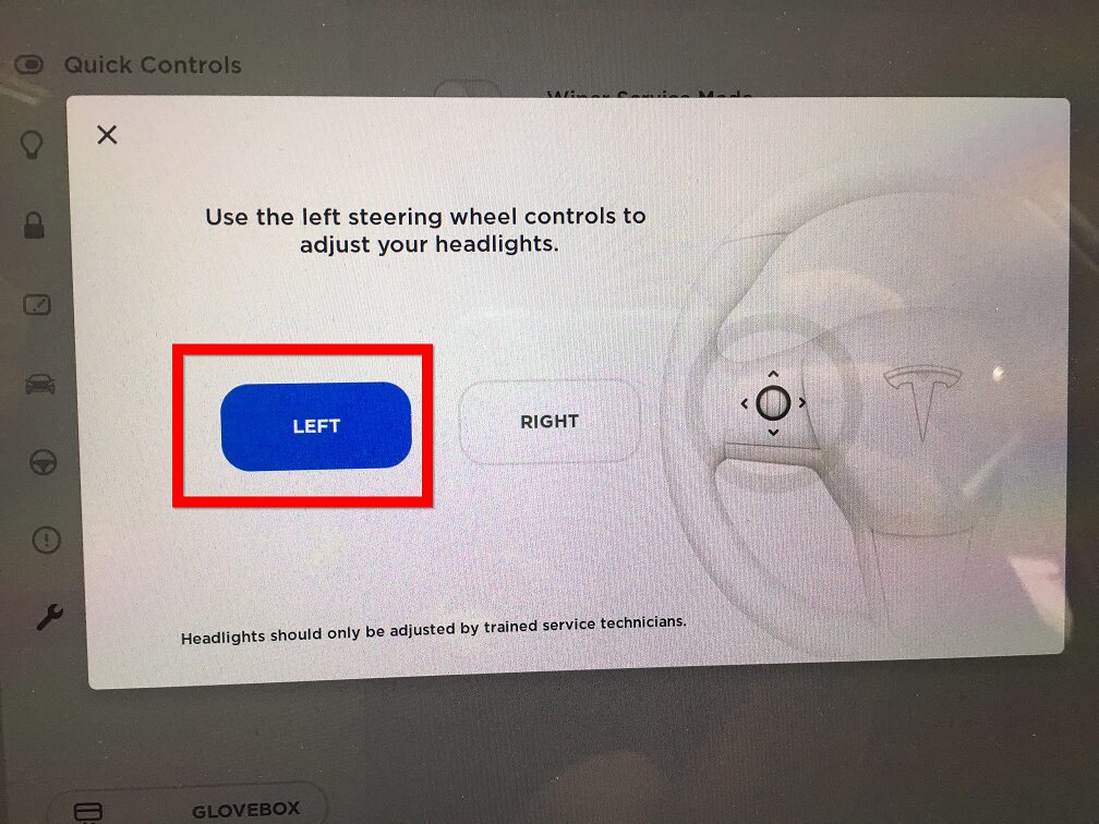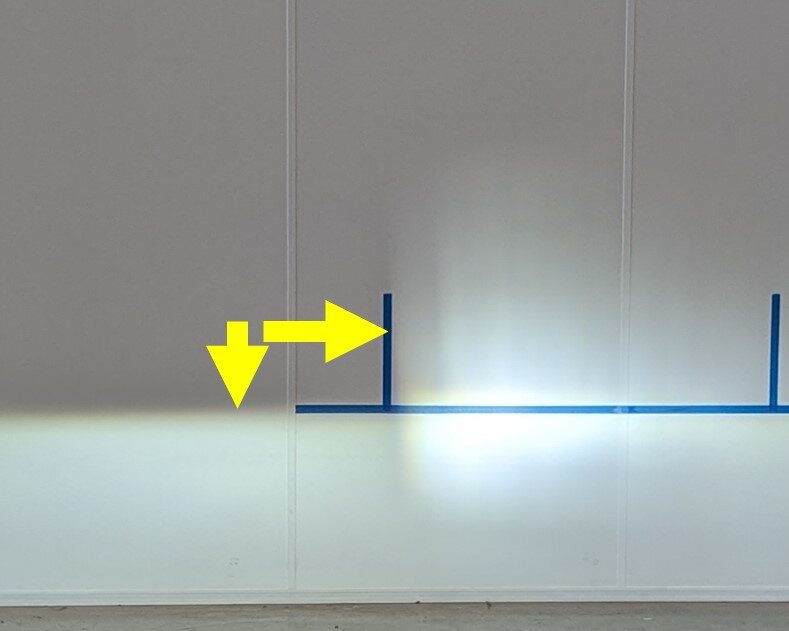 调节左侧前照灯:点击触摸屏上的Left,然后使用方向盘左滚轮调整光束水平。调整左侧前照灯,使水平光束顶部与墙壁上的水平胶带标记对齐,且 “L” 型光束的左边缘与左侧垂直参考胶带标记对齐。