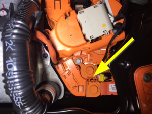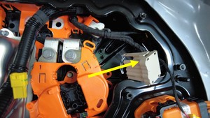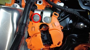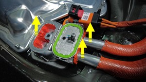 - Press the tabs on both sides by hand, and lift the connector upwards to disconnect the LV fast charge contactor connector.