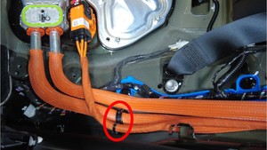 - Position the charge port busbar connector on the cross-member in front of the ancillary bay for access.