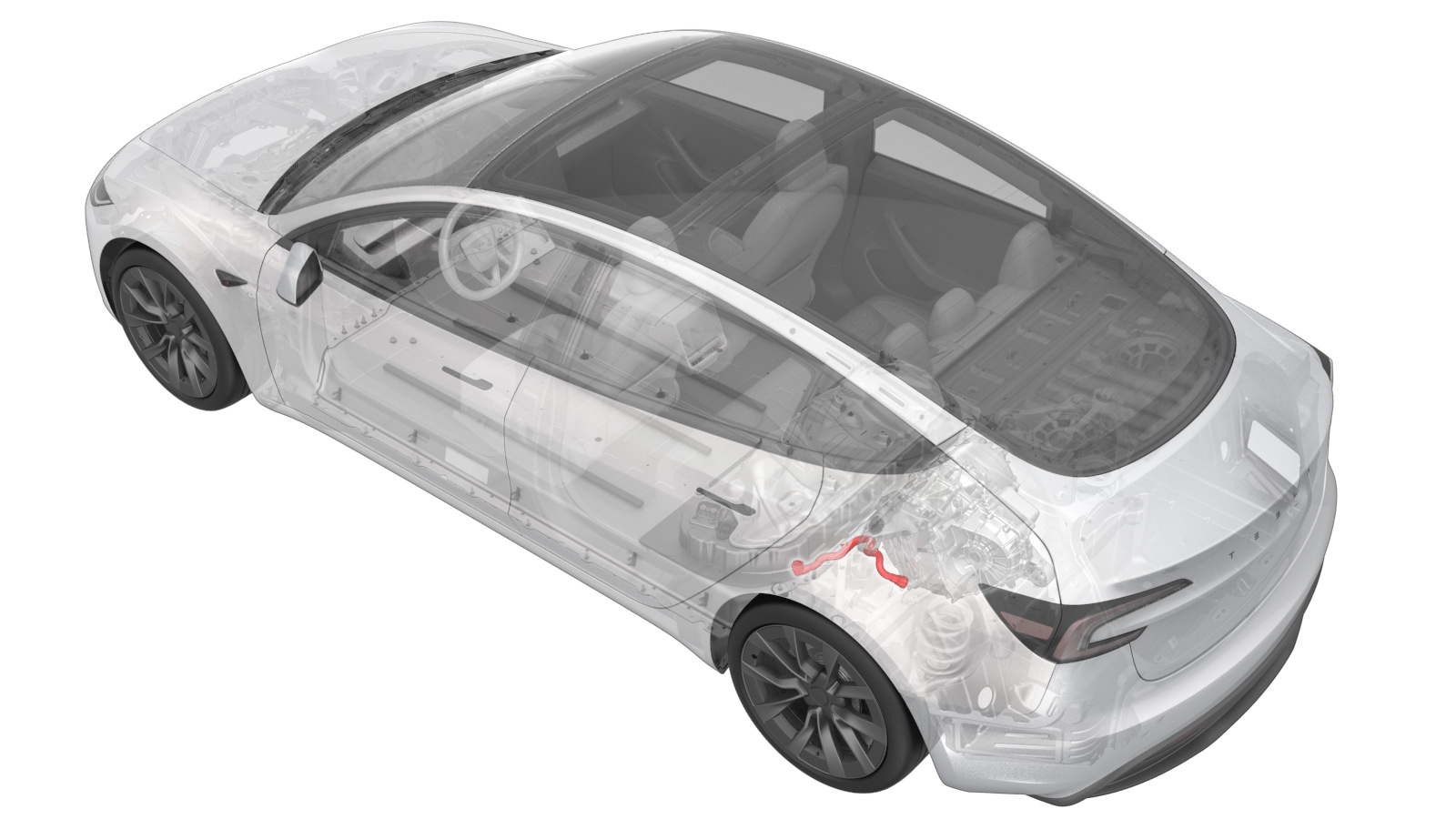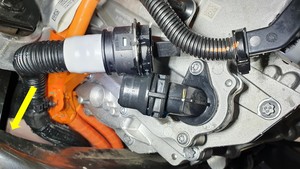 - Remove the rear drive unit inverter inlet hose down and out from between the rear subframe and the HV battery.