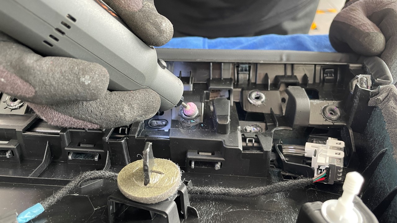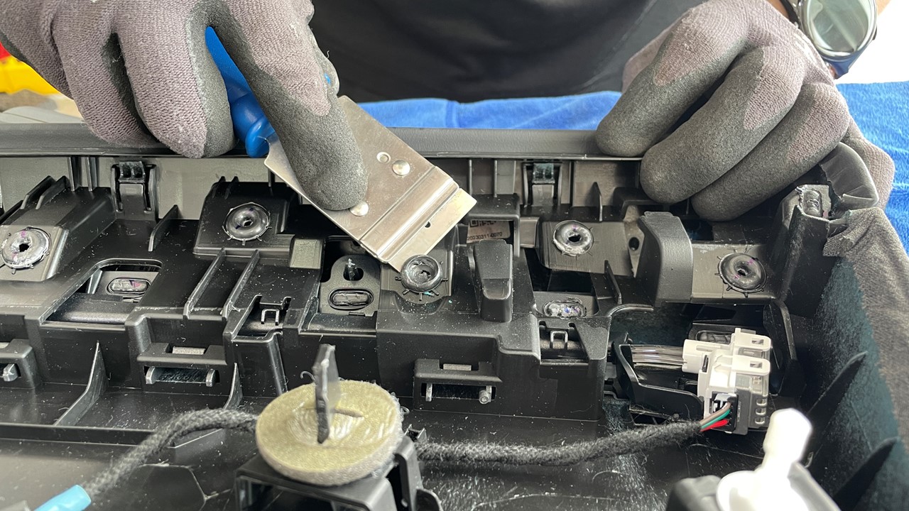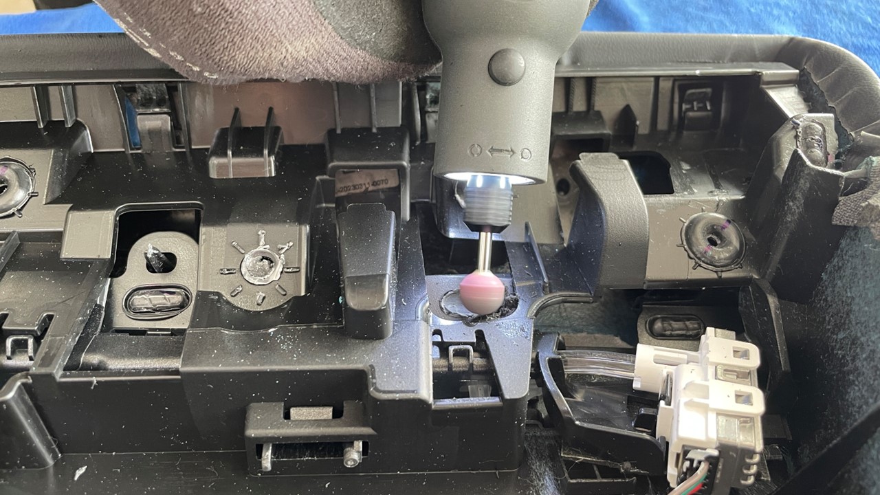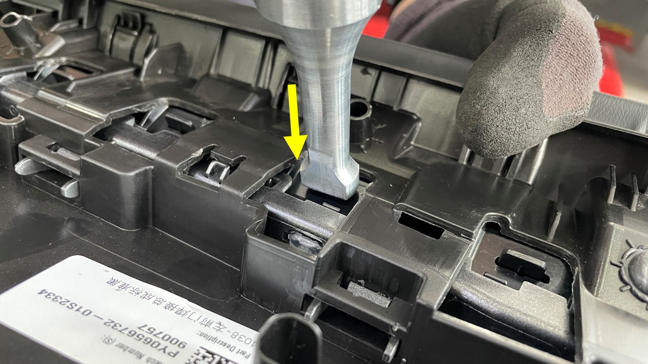 警告请勿对氛围灯附近的锁片进行抛光。警告注意请勿损坏车门板。注若为圆形热压锁片,对中间进行抛光,以便拆卸。若为方形热压锁片,应完全进行抛光,以便拆卸。提示: 推荐使用以下工具: