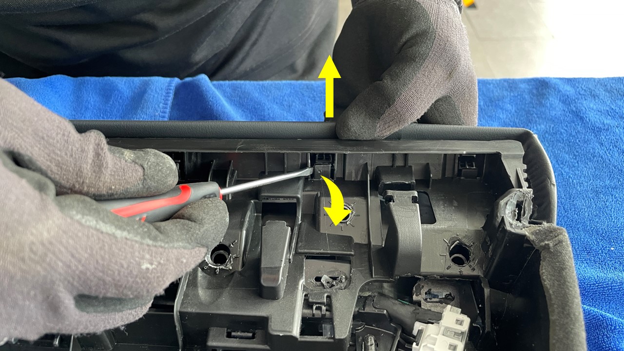 - 在协助下,将氛围灯亮条从左前车门板上拆下。