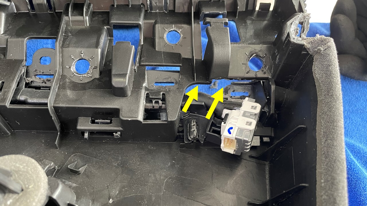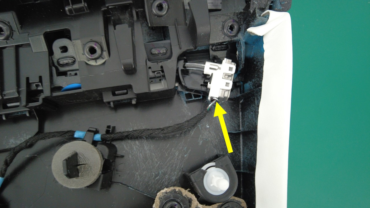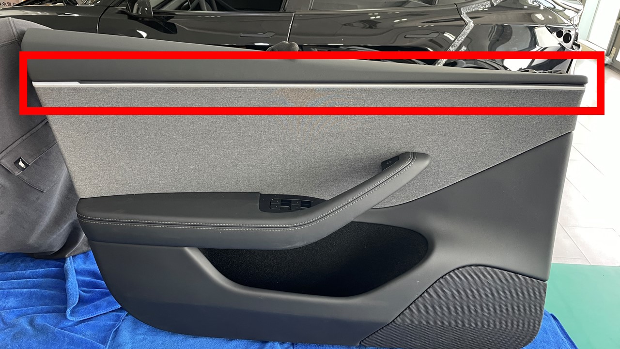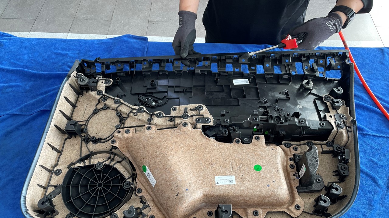 在协助下,将氛围灯亮条安装到左前车门板上。