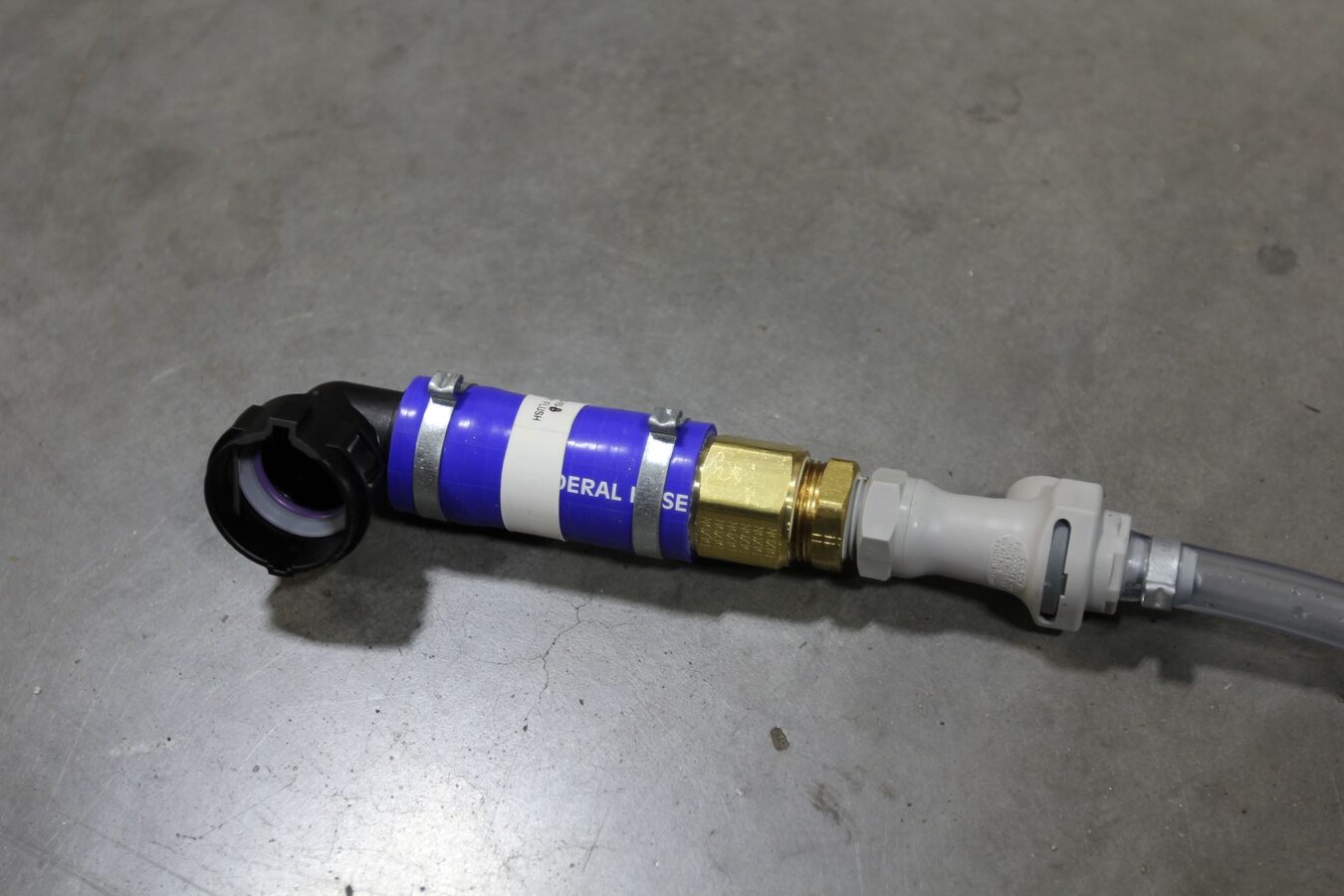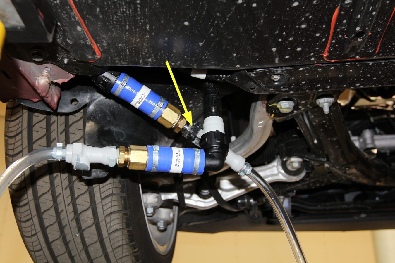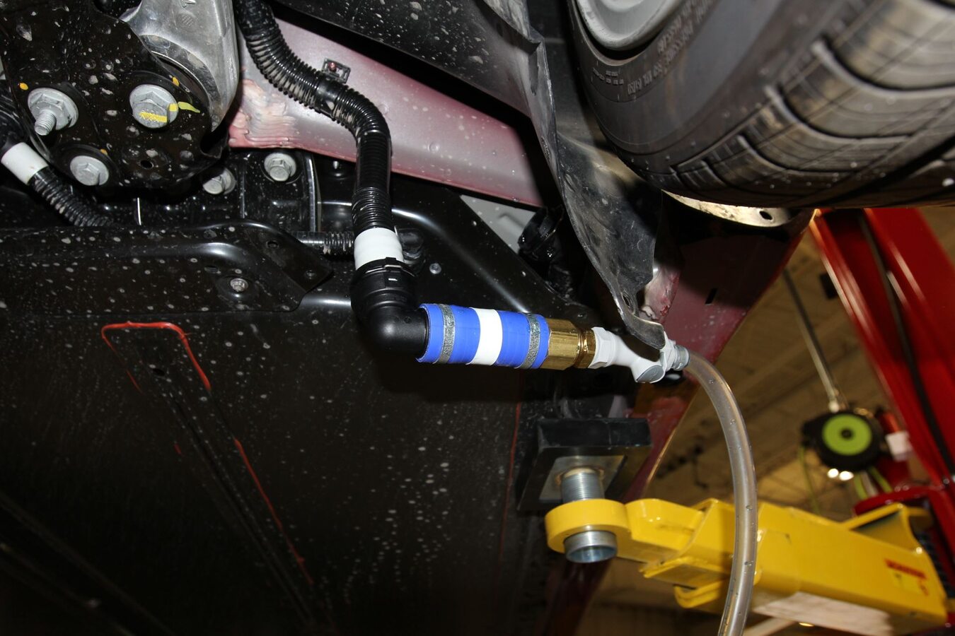 取下接头端部的塞子,然后将后驱动单元出口软管连接到动力总成回流管。