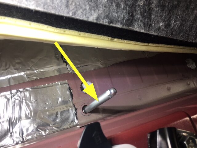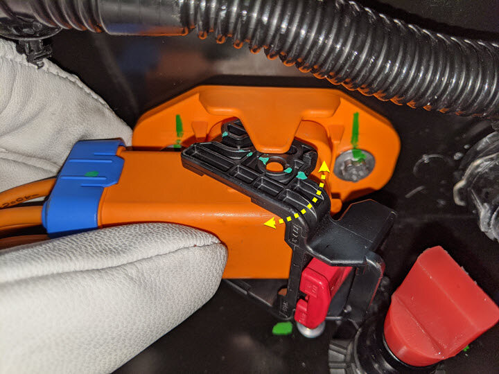 - 松开推拉式卡子(2 个),将后部地毯向回拉动,以接触高压电池后侧内部螺栓。