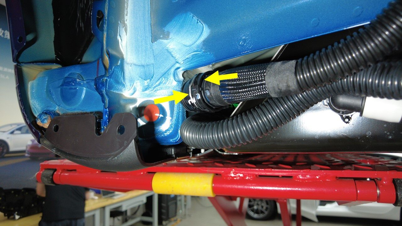 取下接头端部的塞子,然后将后驱动单元变流器进口软管连接到高压电池左后侧。