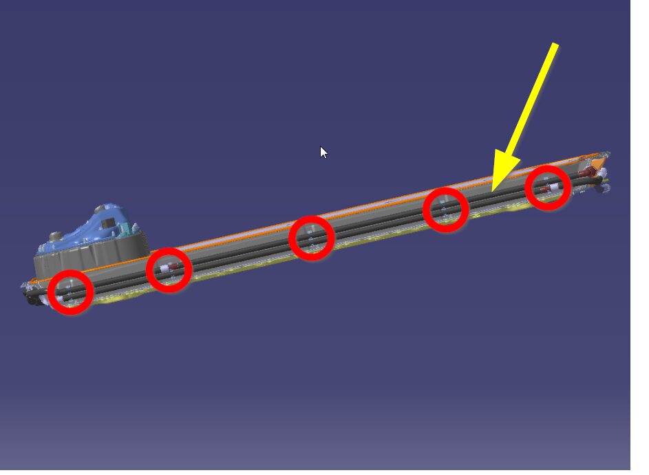 - 将高压电池校准杆安装在车辆前侧车身处以及高压电池仓附近电池处。