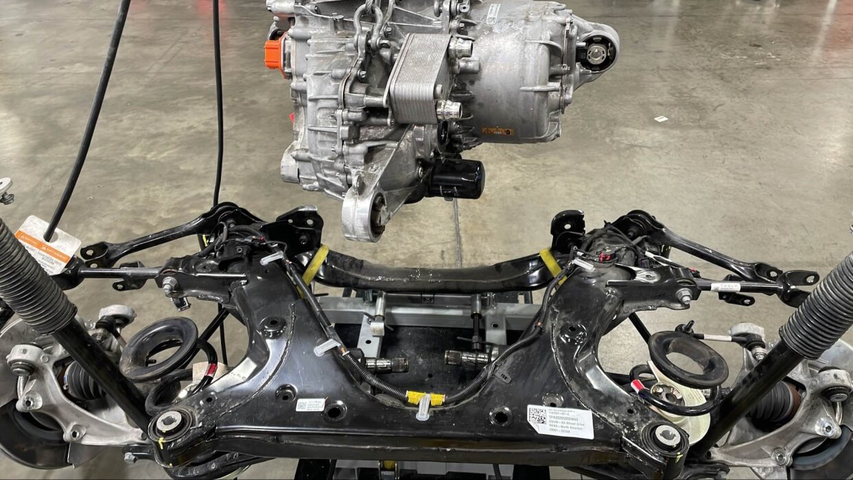 在协助下,将左半轴花键放置入味并与后驱动单元对齐。