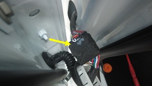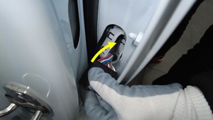 - 推动左后车门线束,将其穿过前门内侧线束端口,然后将线束从车辆上拆下。