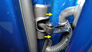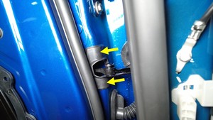 - 使用塑料饰板工具松开将左前车门限位器固定到左前车门的卡子(3 个)。