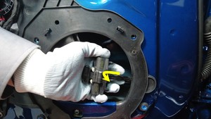 - 将手伸入扬声器支架开口,将限位器从车上拆下。