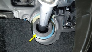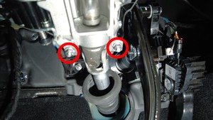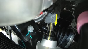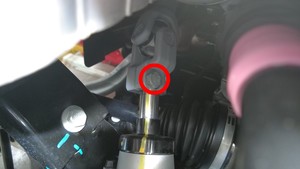 - 在协助下,将转向柱中间轴向下滑到转向机构输入轴上,确保轴对齐并且完全就位。