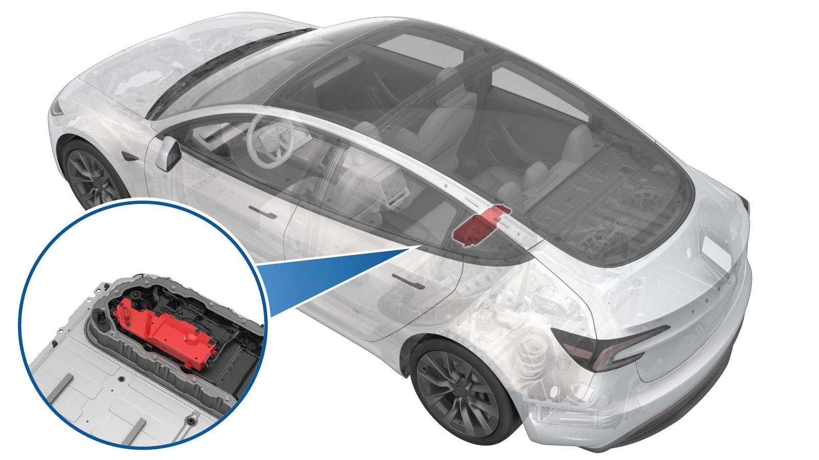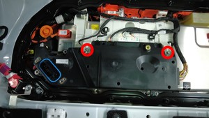 将高压控制器安装到高压电池仓上,然后安装将高压控制器固定到铰链托盘的螺栓。