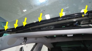 - 沿挡风玻璃顶部安装挡风玻璃线束,然后紧固将线束固定到挡风玻璃的卡子(6 个)。