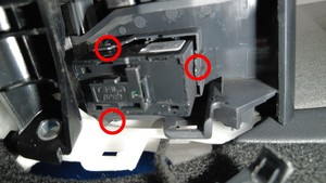 松开将左后车窗开关固定到车门饰板的锁片(3 个),然后将开关从车辆上拆下。