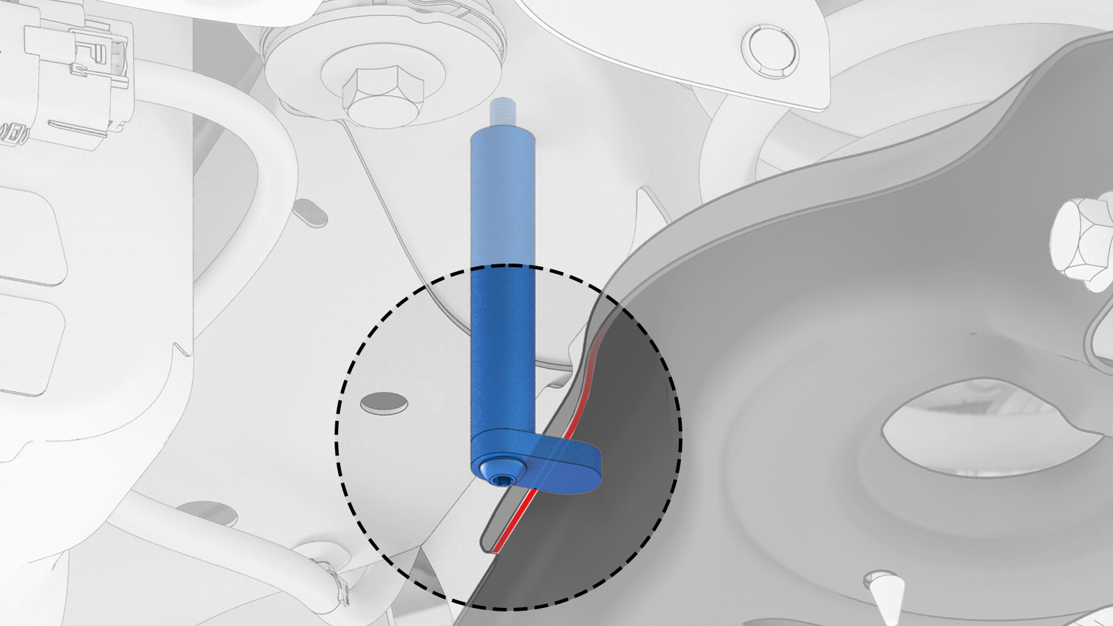 - 调整托臂支架和/或弹簧压缩机,使后部行驶高度扭矩工具的底梁靠在下尾连杆的底部边缘上(如图所示)。