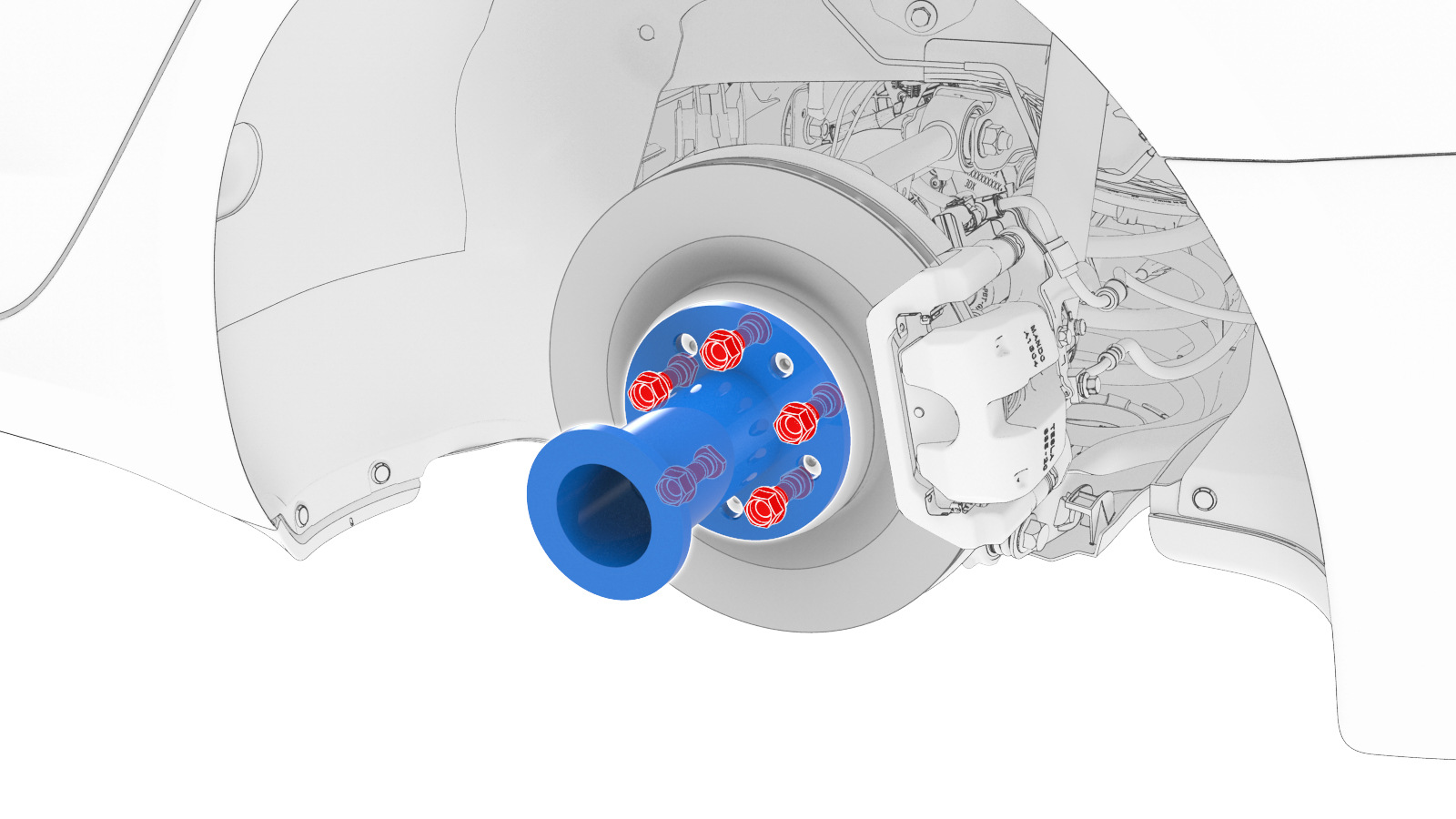 - 将轮毂轴承千斤顶适配器安装到左后轮毂轴承上,然后手动拧紧带耳螺母(5 个)。