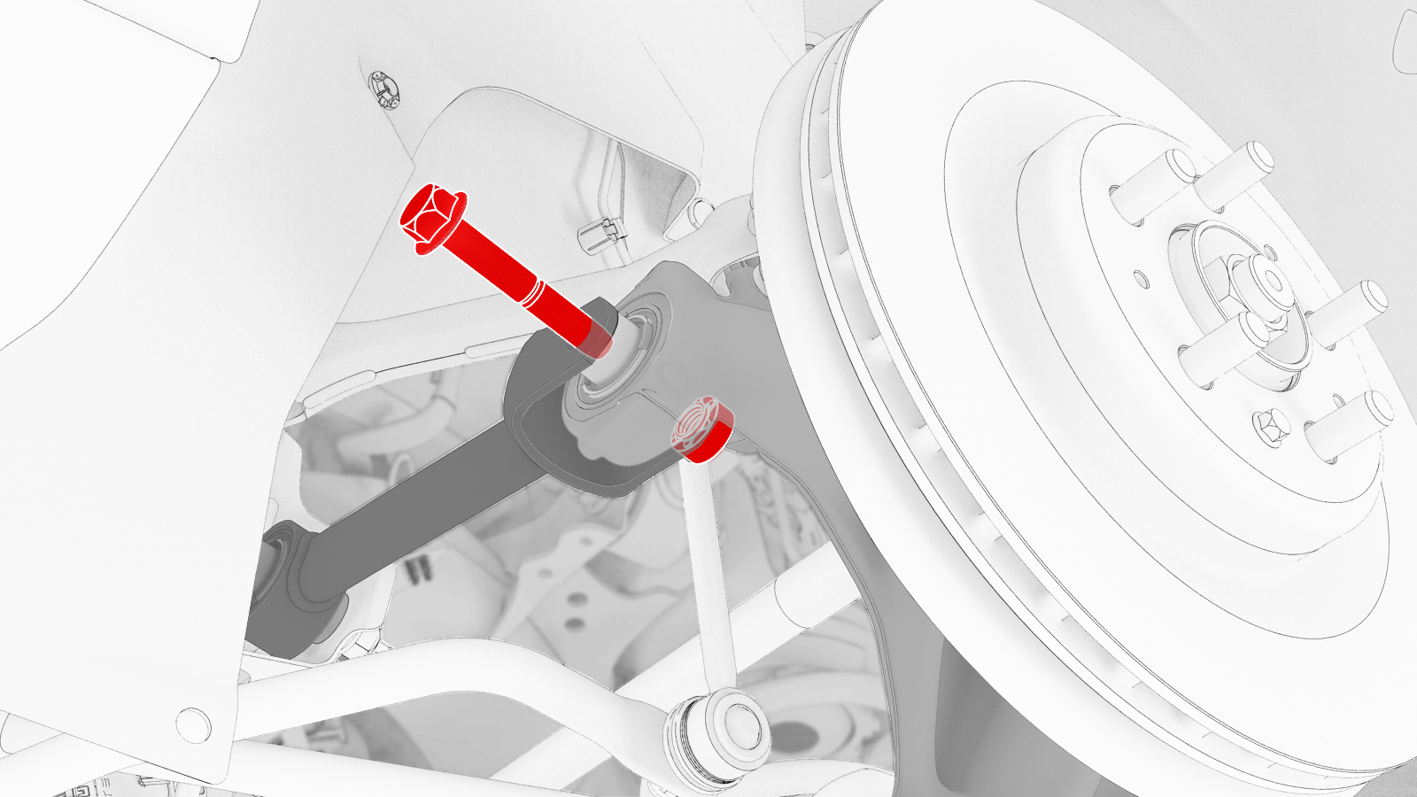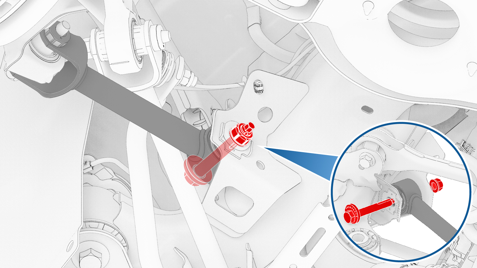 将左后止推杆放置到转向节上,然后安装螺栓和螺母并手动拧紧。