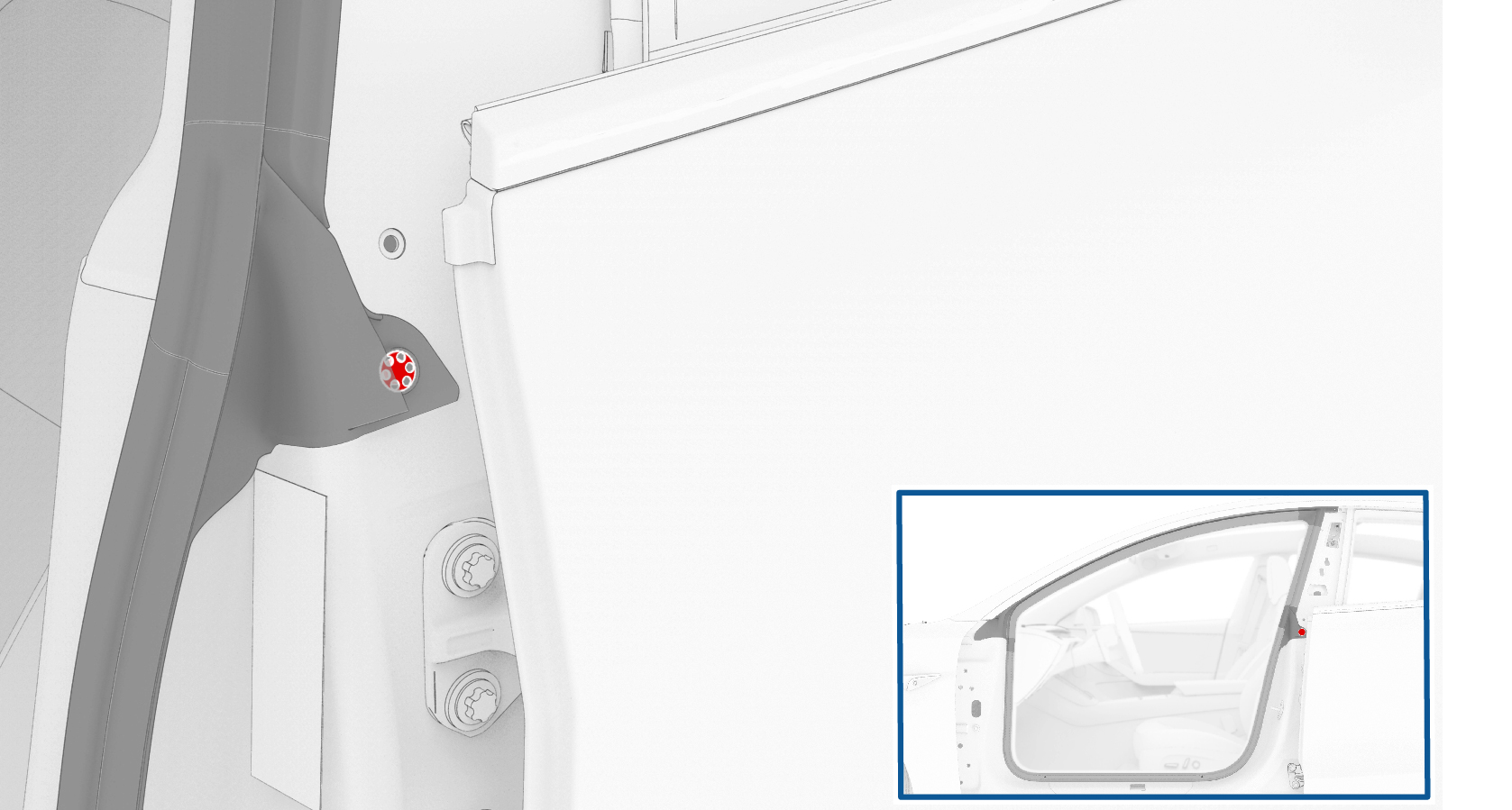 - 安装将左前车身主密封条固定到 B 柱中部以及 A 柱的卡子(2 个)。