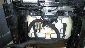 - 将加热器线束穿入第一排右侧座椅靠背外罩底部上的孔中。