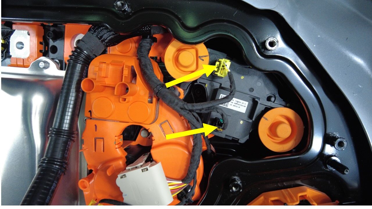 - 将高压电池仓线束连接器(2 个)连接到负极电池组触点开关。