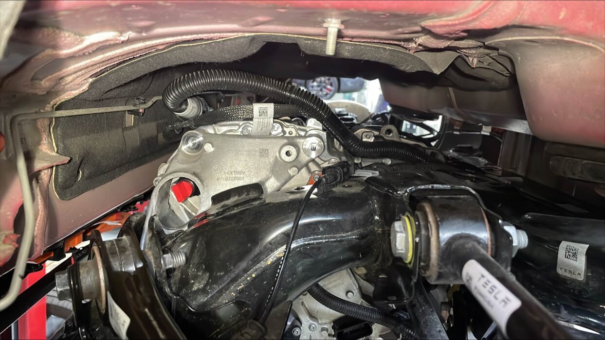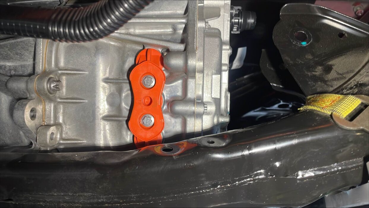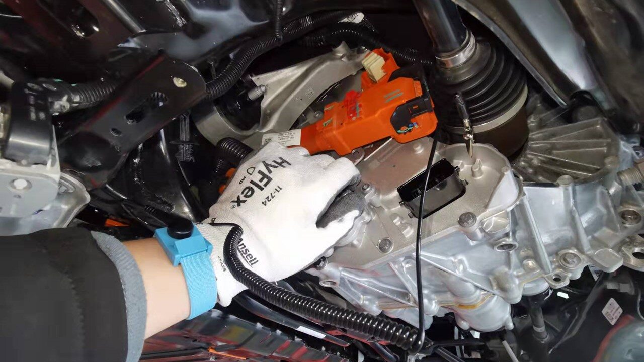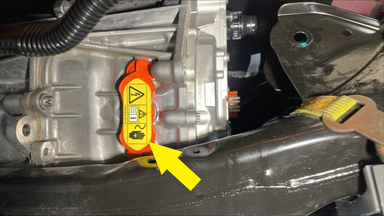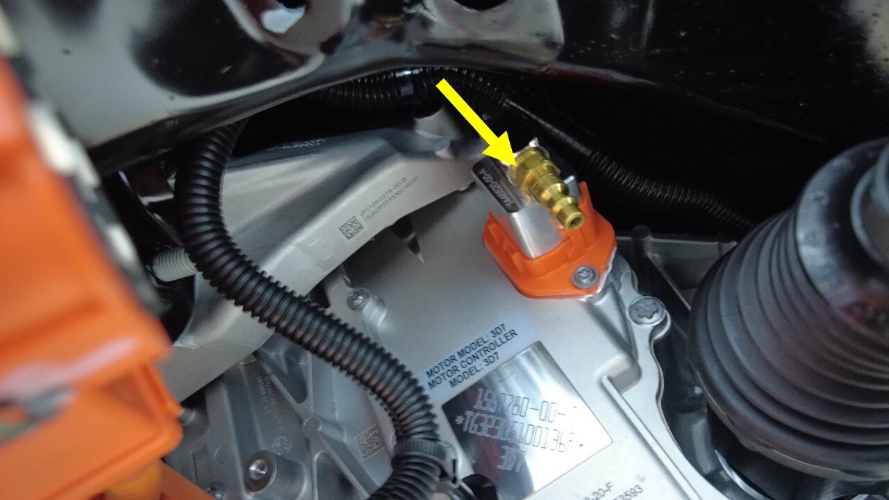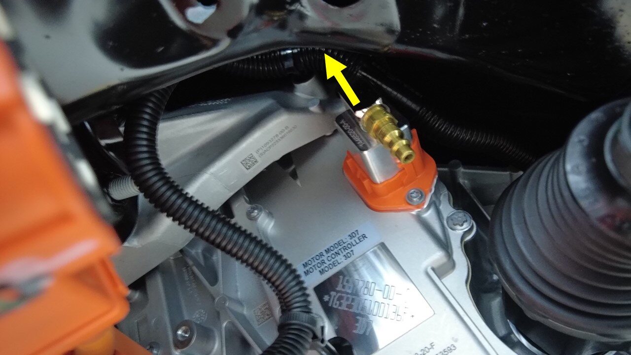 从高压电池左后侧断开后驱动单元变流器入口管。