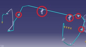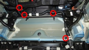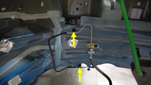 - 将右前制动管路穿过前副车架区域,拉至右前轮拱内衬区域,再拉至左侧车架纵梁区,然后紧固夹子(5 个)。