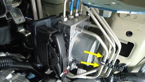- 松开将右前制动管路固定到车辆的卡子(4 个),然后将前制动管路管束从车上拆下。