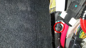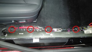 - 松开将右前座椅线束固定到右侧脚部空间支架(位于右侧脚部空间右端附近)的卡子。