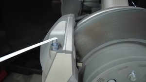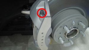 使用塑料饰板工具将右前制动钳外部制动排放阀罩拆下,然后松开阀门,使一小部分制动液流出后再关闭阀门。