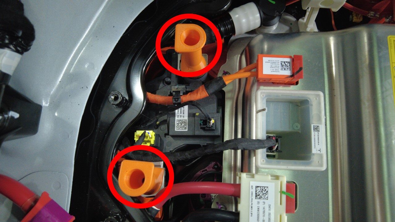Install RH side hose clips to HV battery rear skid plate enclosure