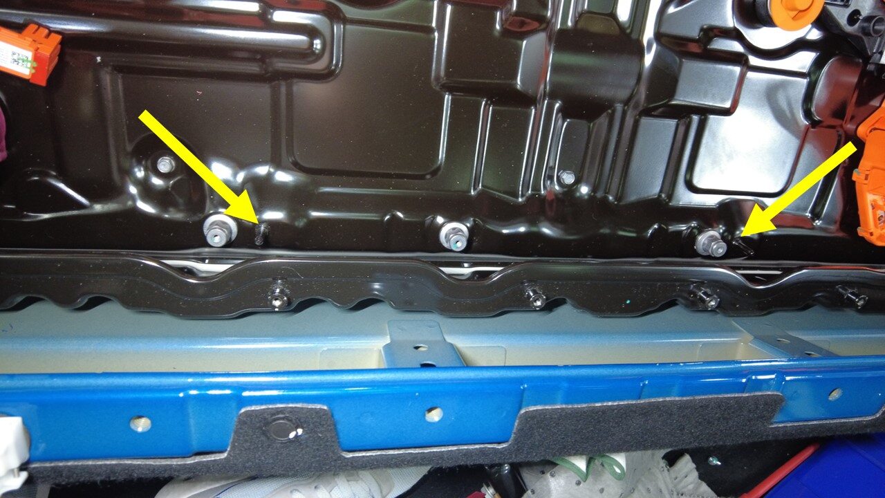 Torque bolts securing HV battery rear skid plate enclosure to vehicle