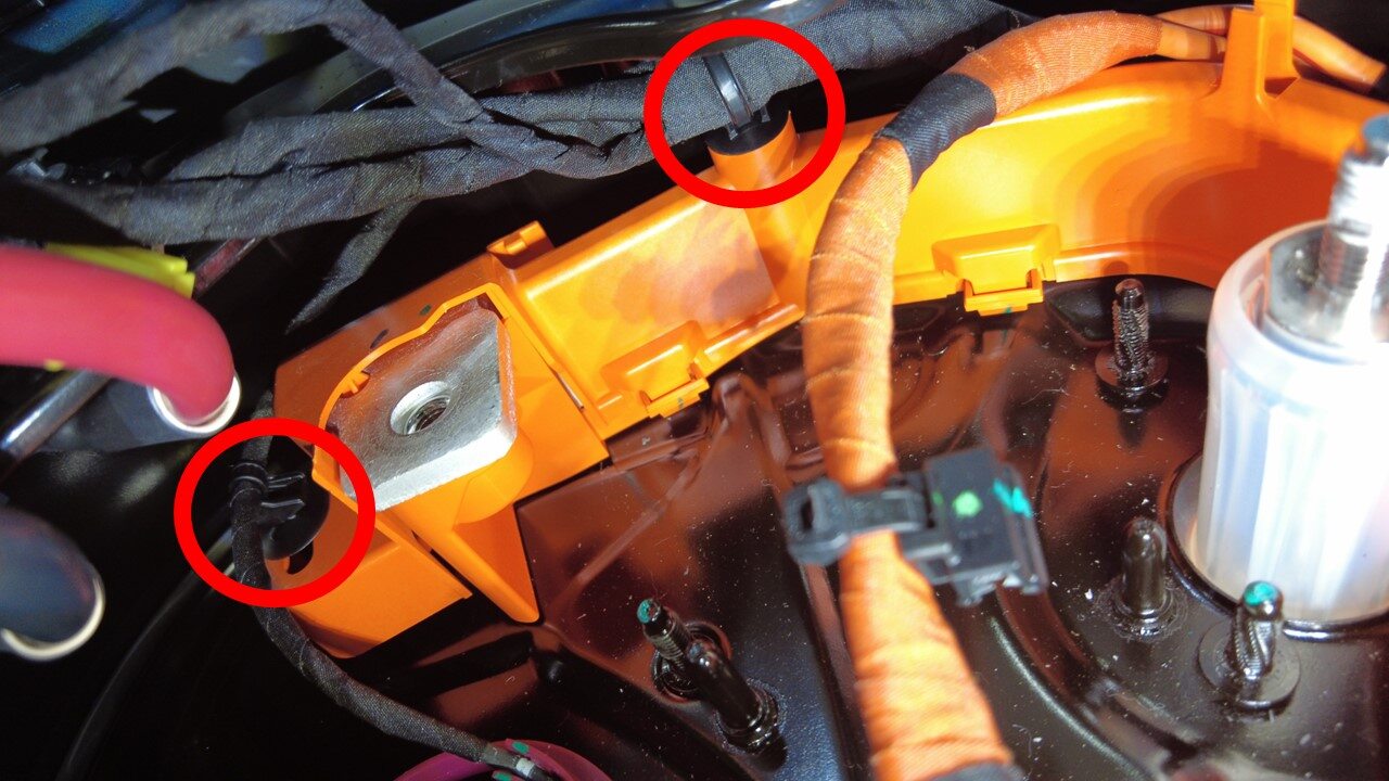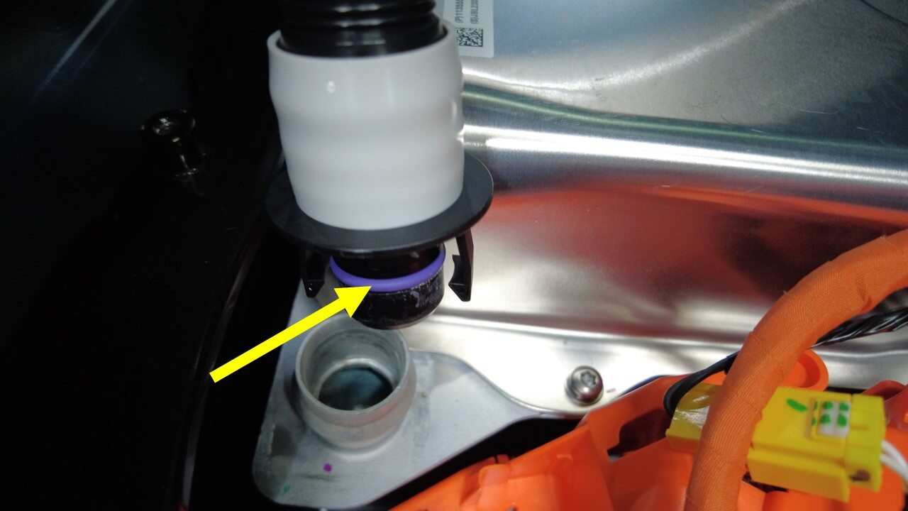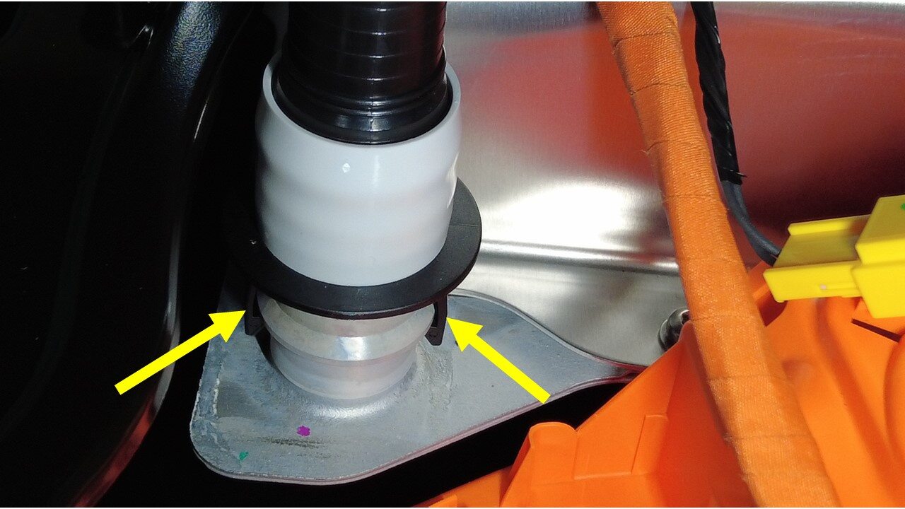 注1x spring clip, 2x plugs, Remove plugs, Perform push-pull-push test to make sure hose is fully seated.Vacuum fill required if > 1L lost during repair
