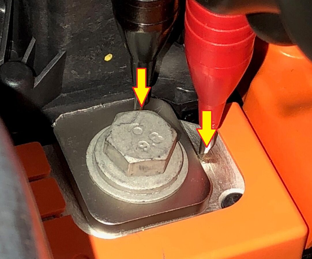 注Set multimeter to DC voltage, Confirm multimeter is properly measuring voltage by testing the 16v battery