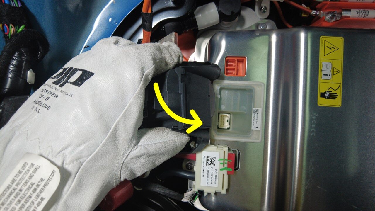 Remove plug from HV battery and connect RDU inverter inlet tube