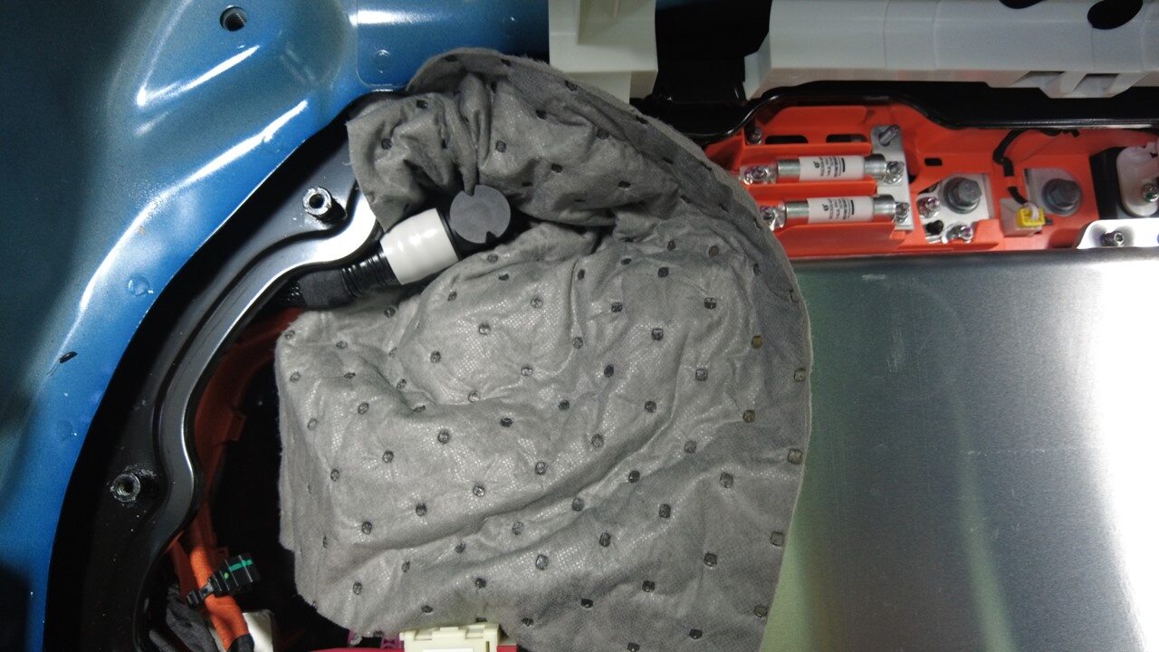 - Position coolant drain container underneath LH rear of HV battery
