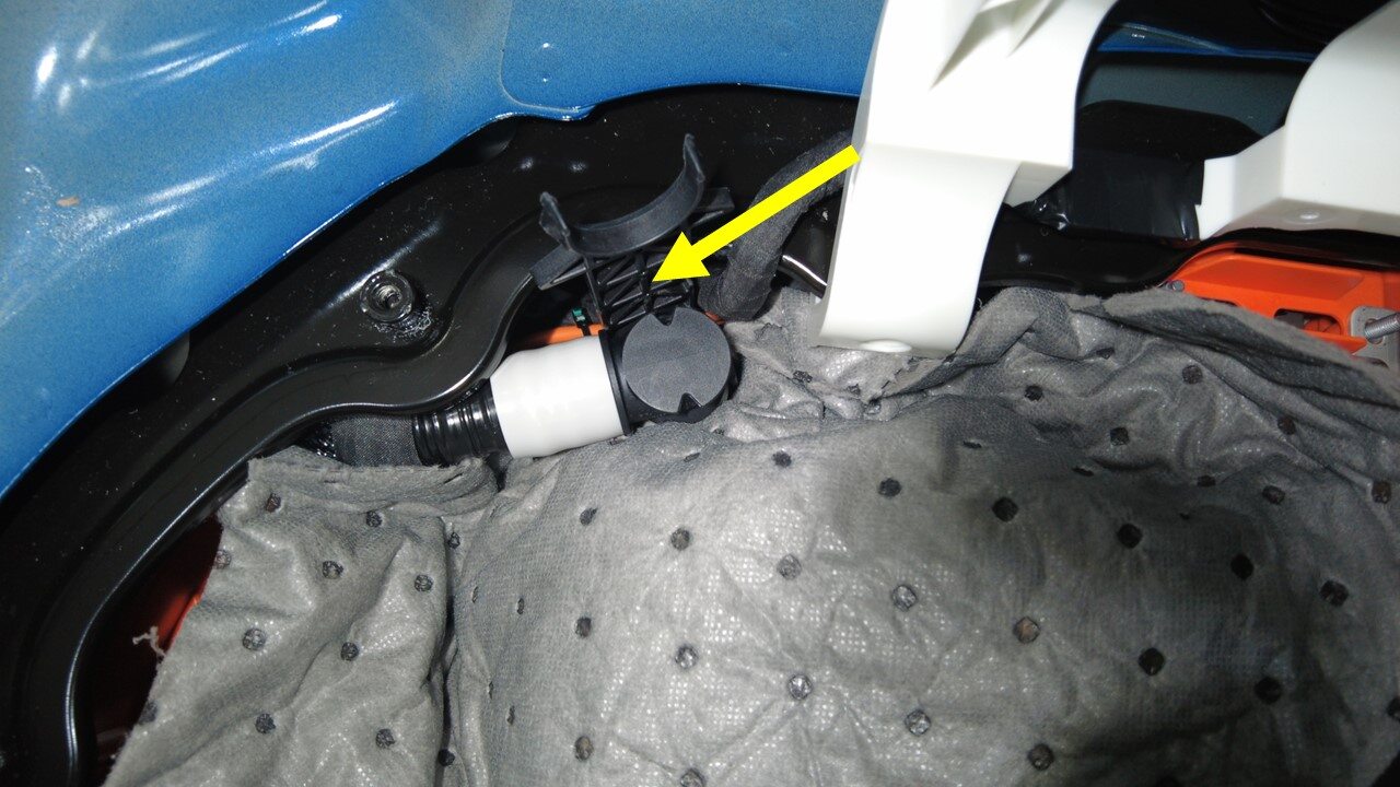 注1x spring clip, 1x plugs, Remove plugs, Perform push-pull-push test to make sure hose is fully seated.Vacuum fill required if > 1L lost during repair