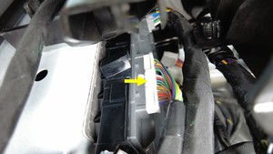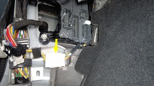 向上滑动左侧车身控制器,以松开 W 型锁片,从仪表板下方移出左侧车身控制器,然后将左侧车身控制器模块从车辆上拆下。
