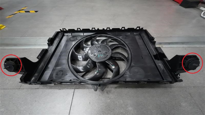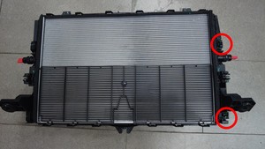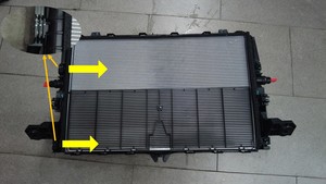 - 将散热器安装到冷却风扇和护罩总成上,然后安装将散热器固定到冷却风扇和护罩总成上的锁片(2 个)和固定支座(2 个)。