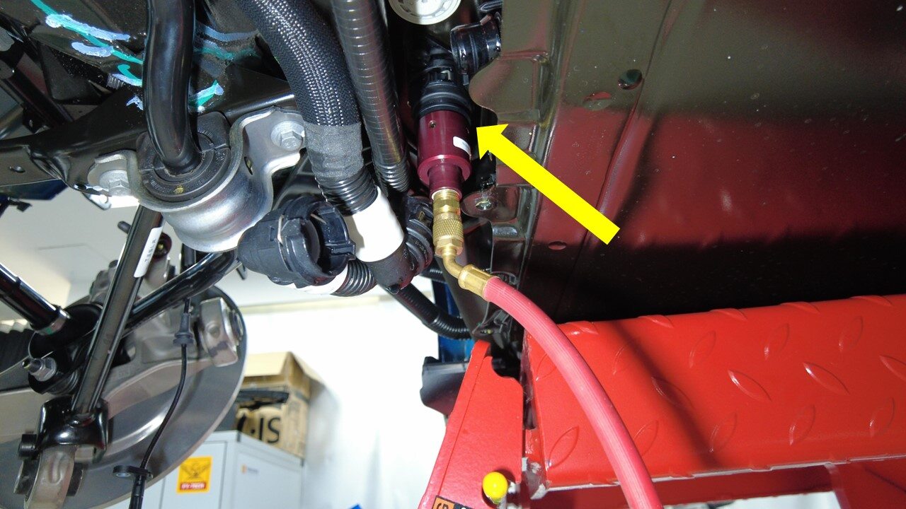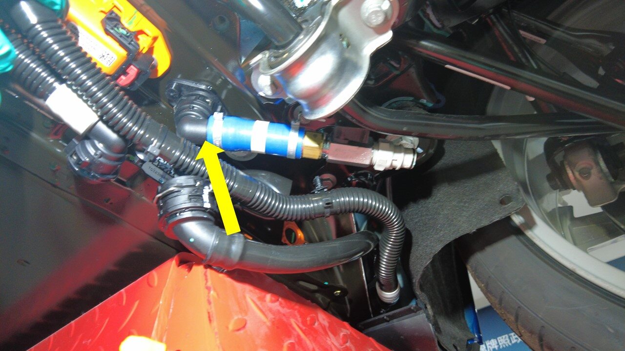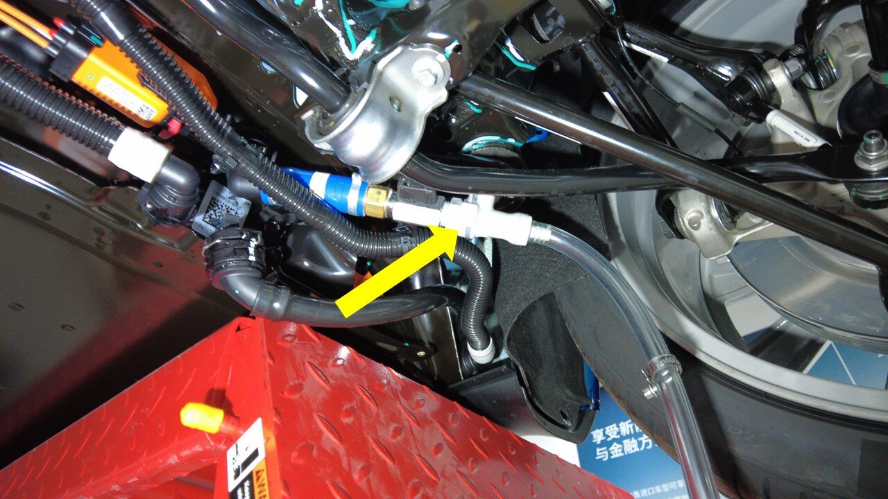 取下接头端部的塞子,然后将左侧冷却液软管连接到高压电池后部。