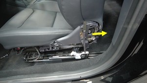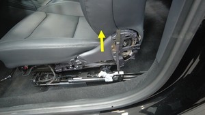 向前推动驾驶位座椅外侧护板支架,使后部锁片(2 个)卡入座椅框架,然后将支架旋转装入座椅总成。