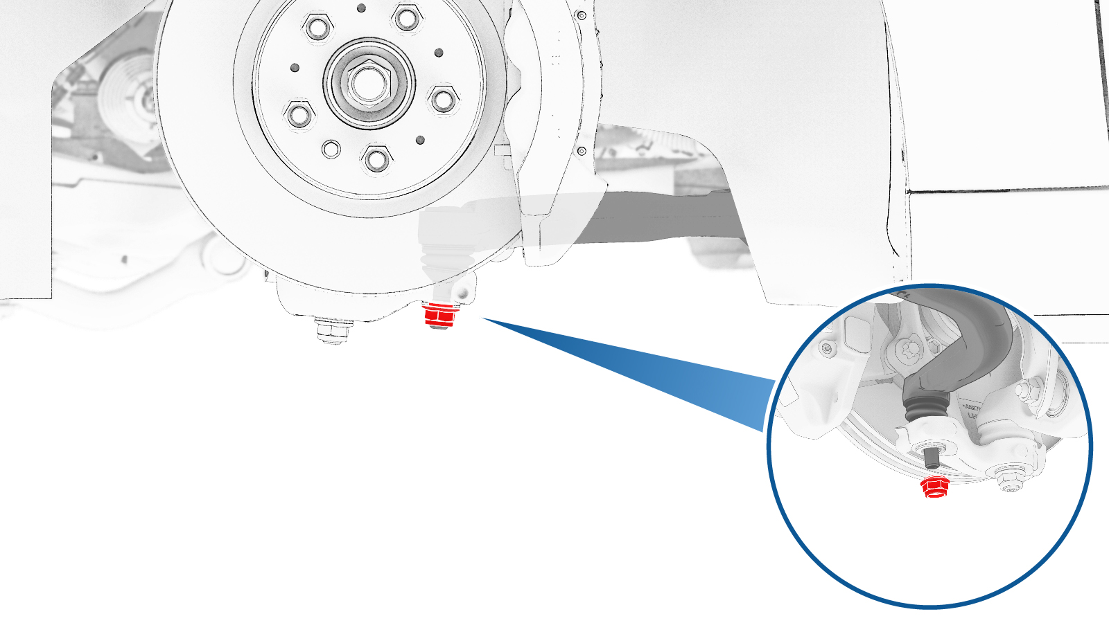 手动拧紧新的螺母,将左前下方挠性连杆固定到转向节,然后紧固螺母。