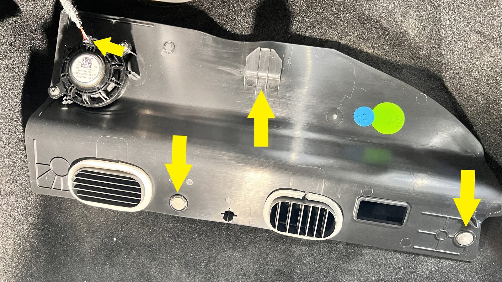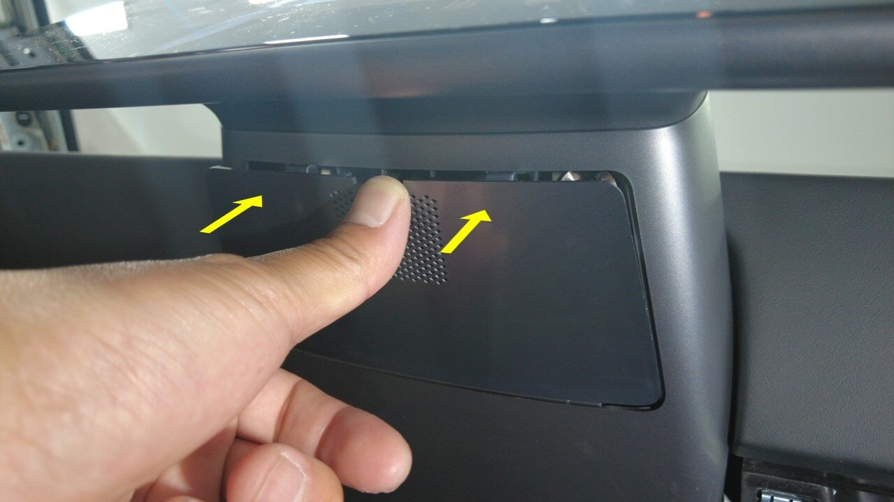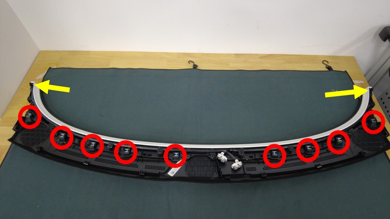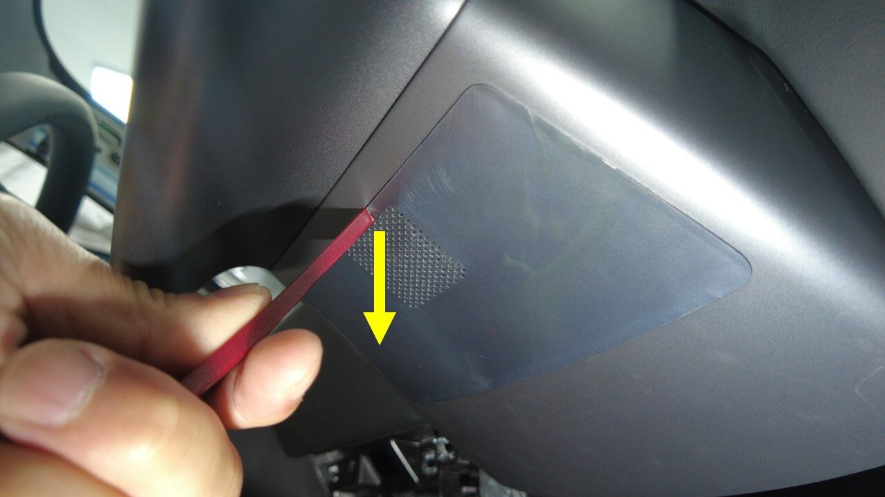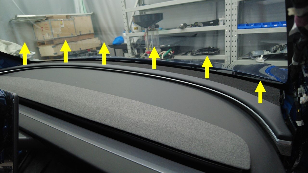 注6x clips, 1x tether, 2x guide tabs,1x alignment pin, Slide bottom of trim along IP and speaker grill, attach tether to body side, Set clips starting at the bottom and work up, Pull seal over trim