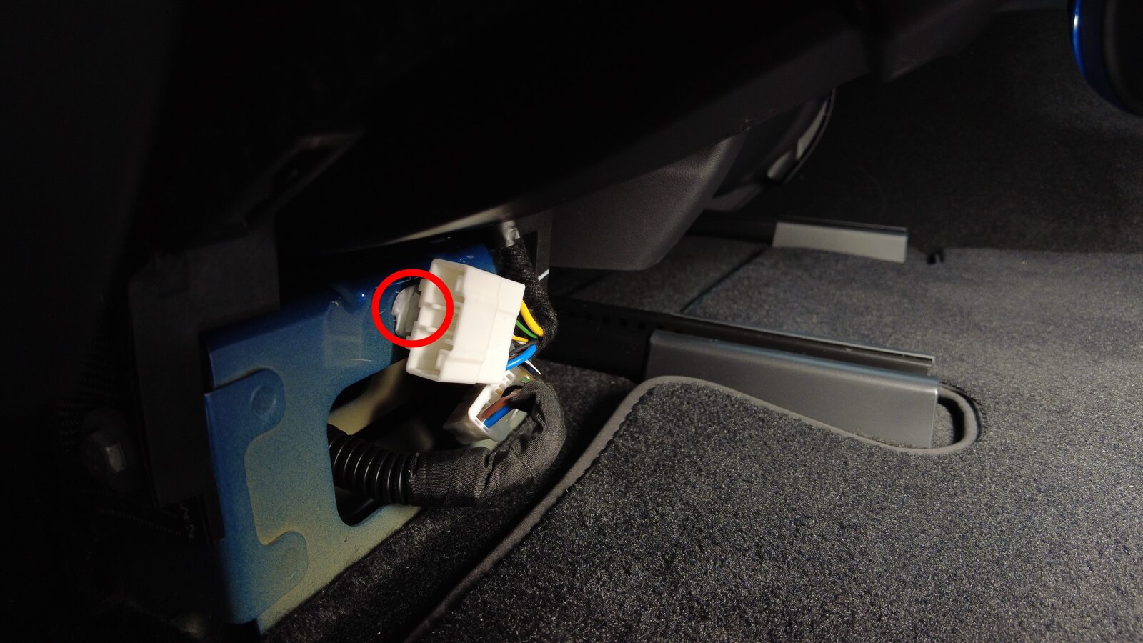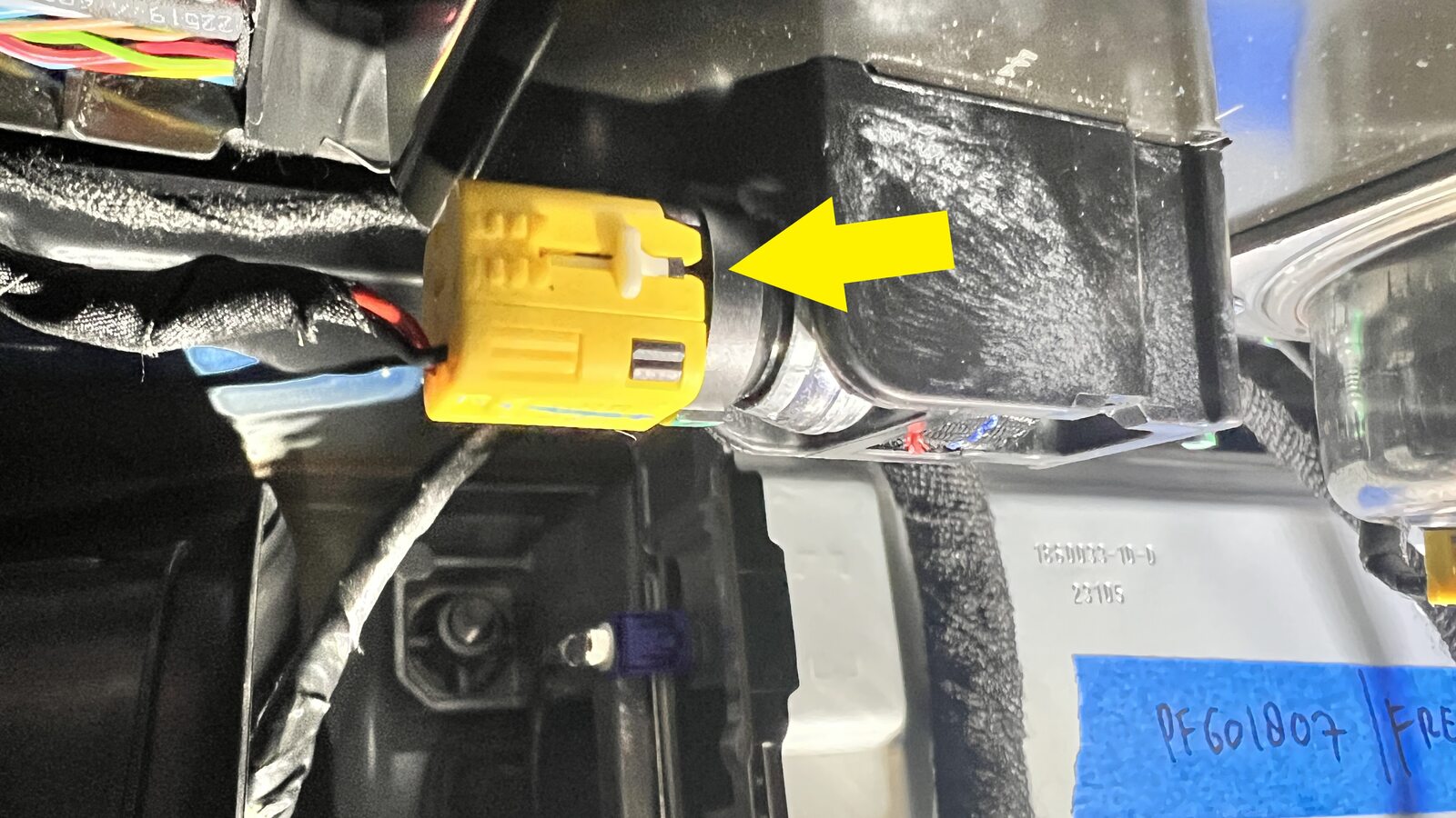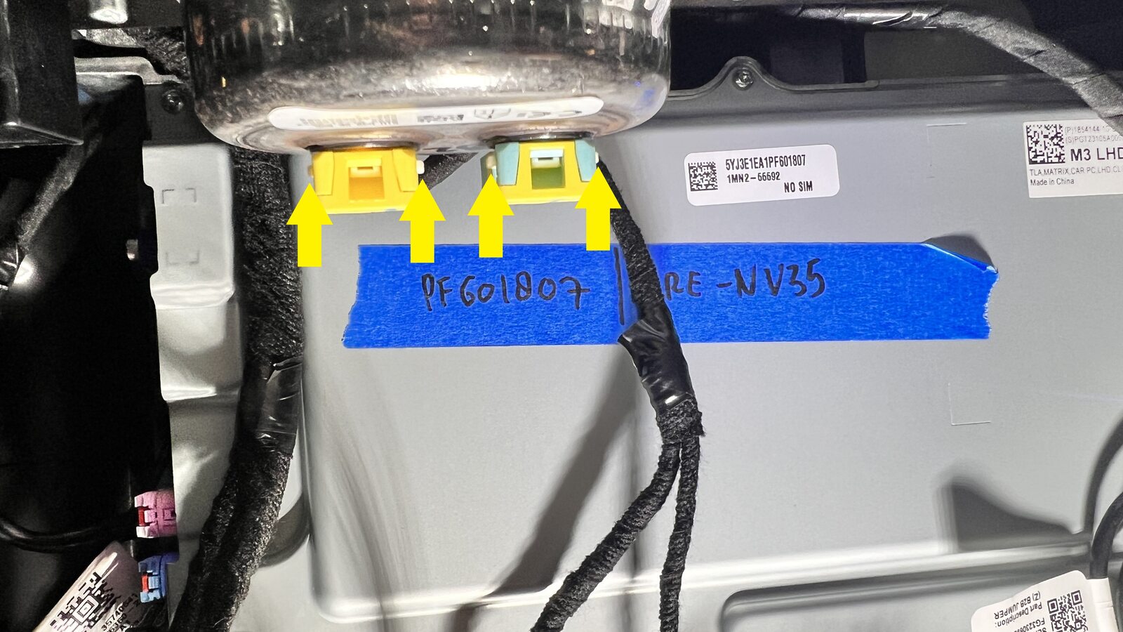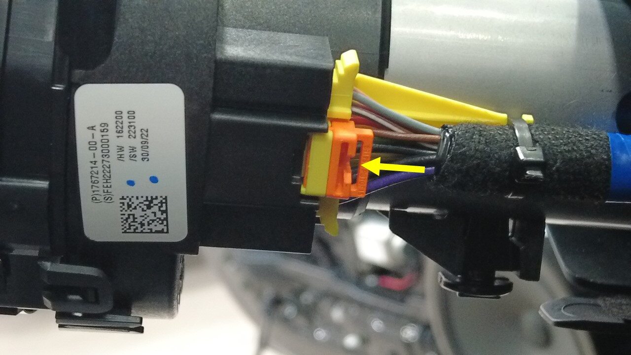 注1x connector, Peel back plastic film, Release by pulling back both white tabs simultaneously, Avoid straining harness, Only one tab visible in image matching tab is on opposite side