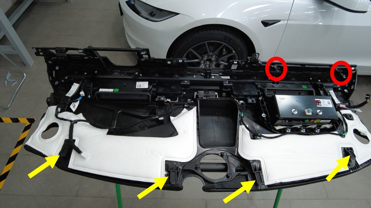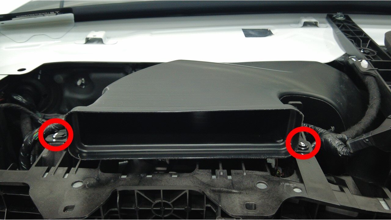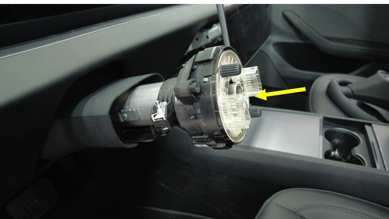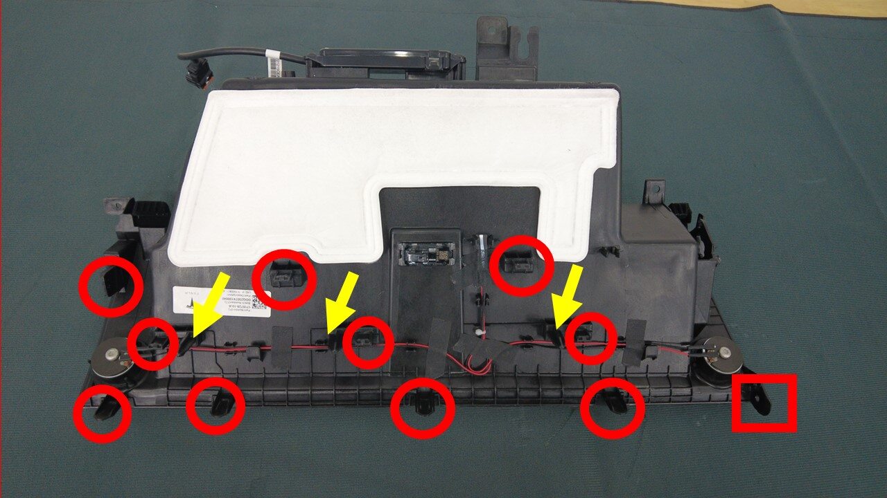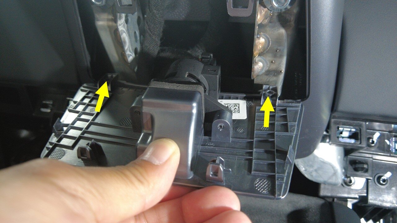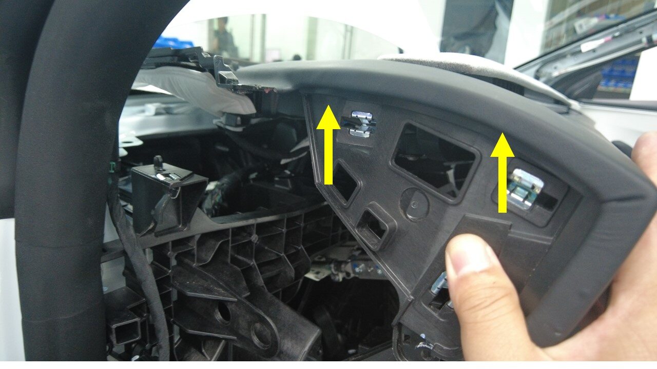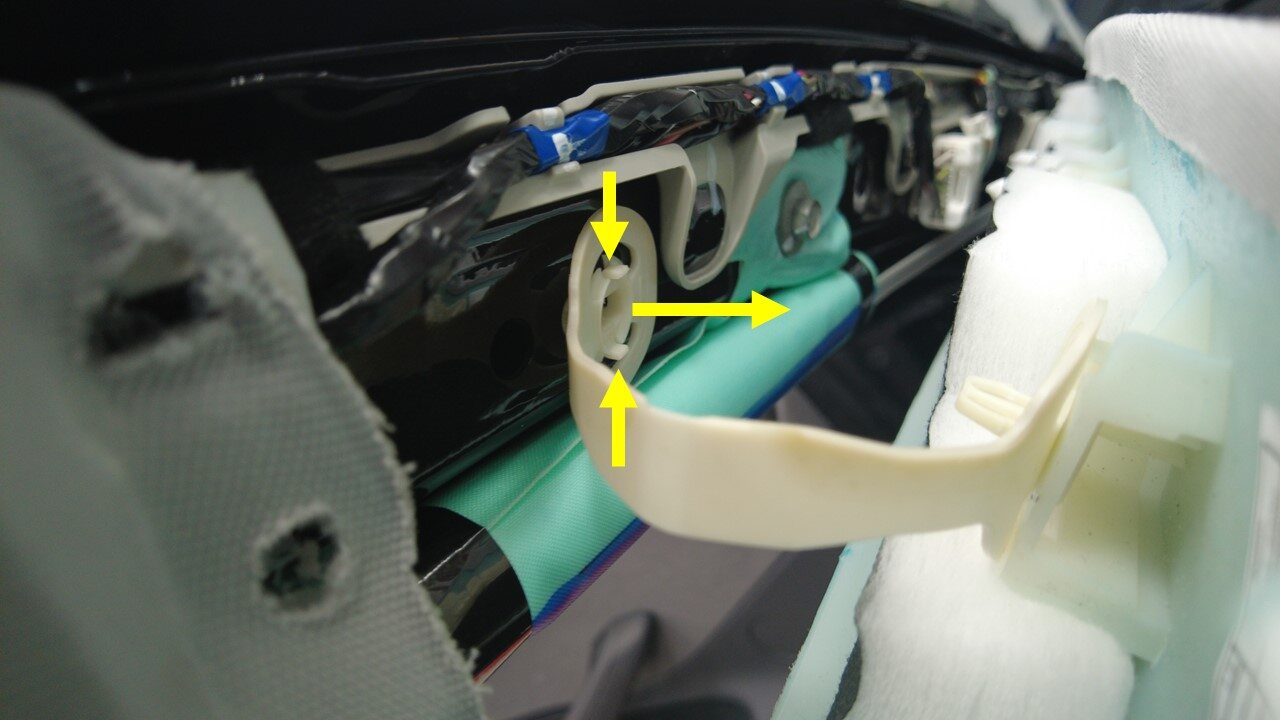 注2x spring clips, 2x datums, Press the spring simultaneously from two access holes to release, Access holes located at 4 and 8 o’clock position, Do not insert tool too far as air bag connector could be damaged