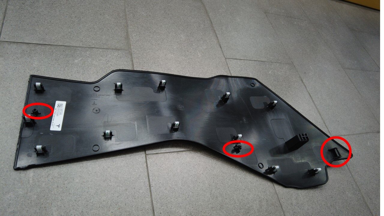 注12x clips, 2x positioning clips, 1x datum, Use trim tool starting at rear edge to release upper clips, If the clip is too tight, Use prytool to remove the clips, Then pull bottom to release remaining clips, Finally, release the datum and pull out the side panel backward, Replace the clips if it is damaged