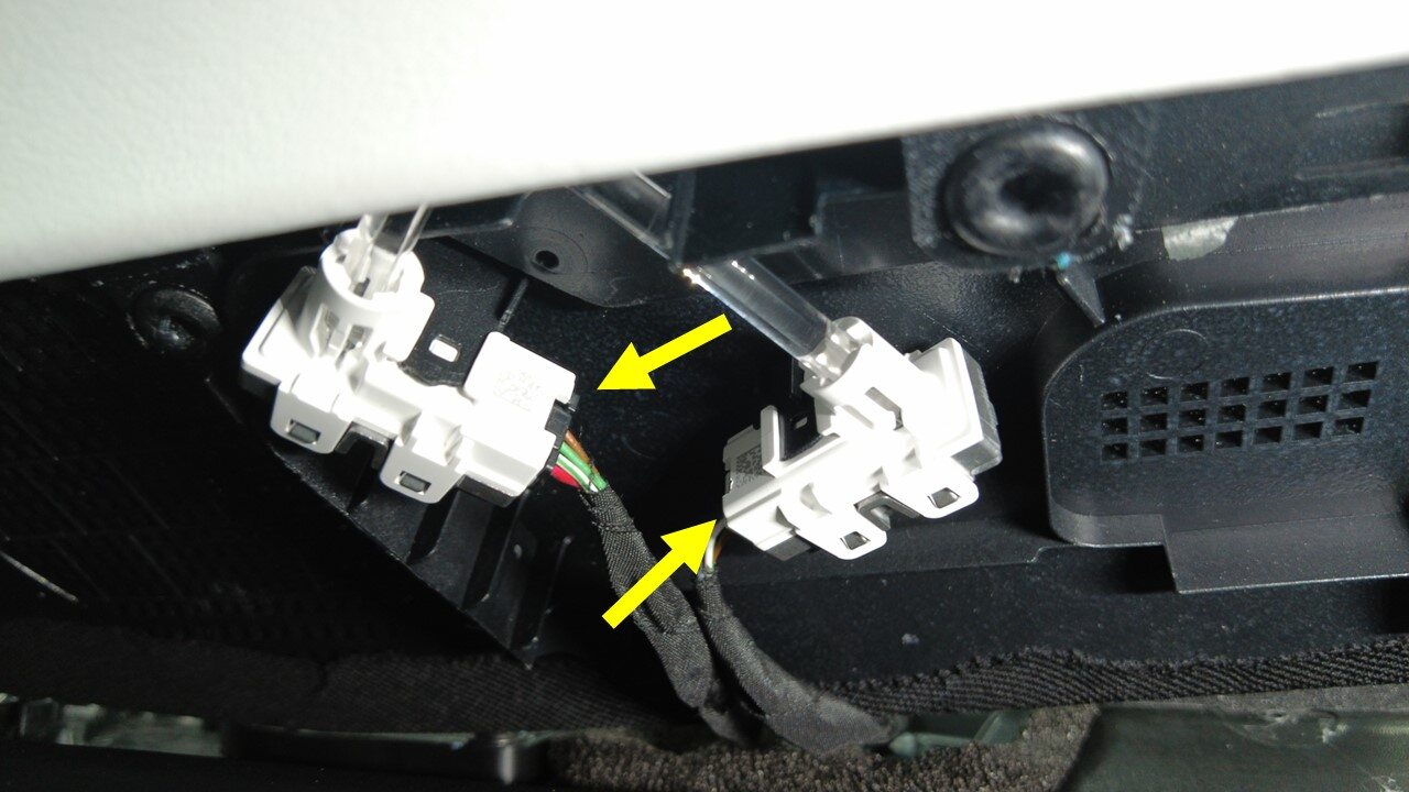 注1x airbag connector, 1x connector, Peel back plastic film, Release by pulling back both white tabs simultaneously, Avoid straining harness, Only one tab visible in image matching tab is on opposite side