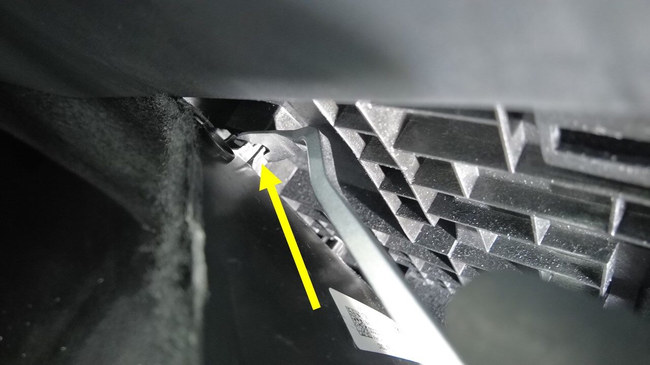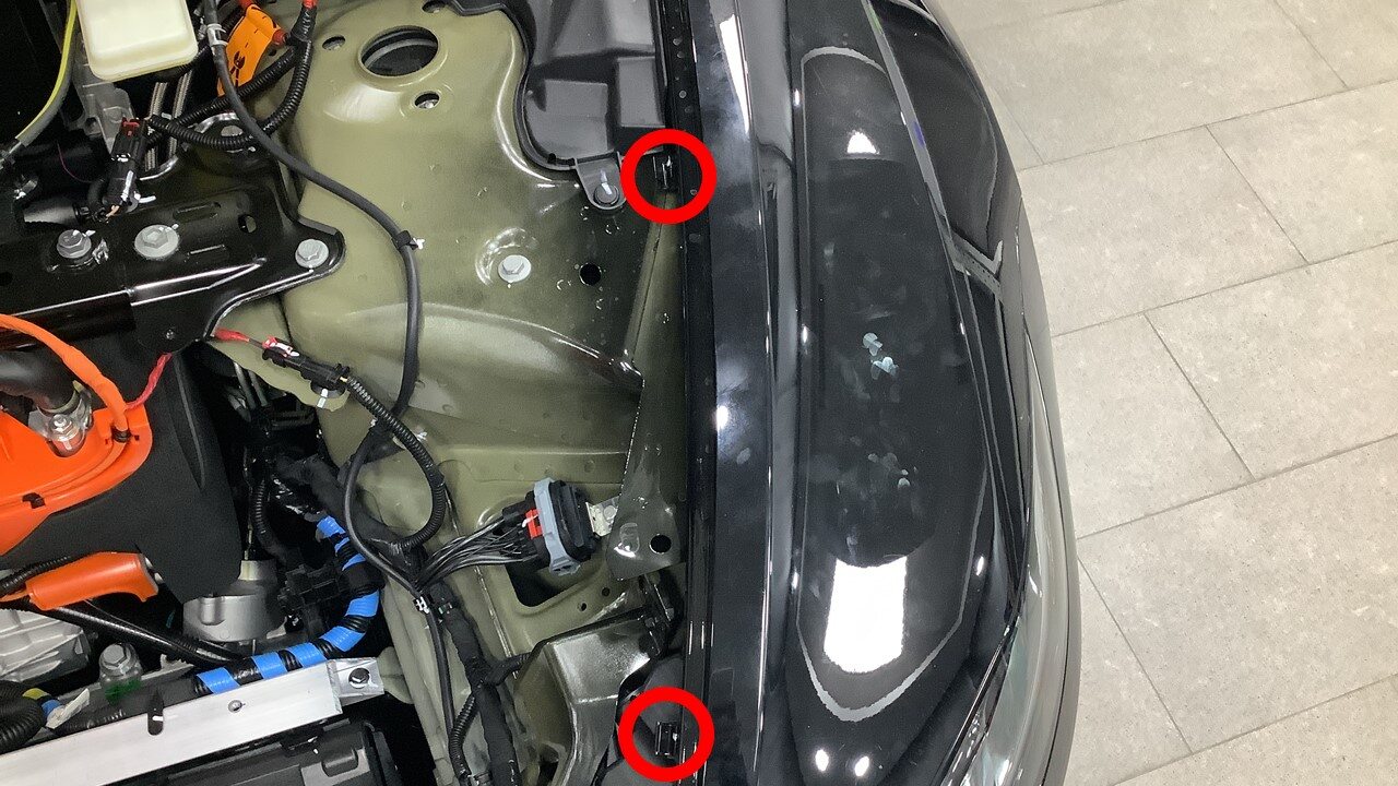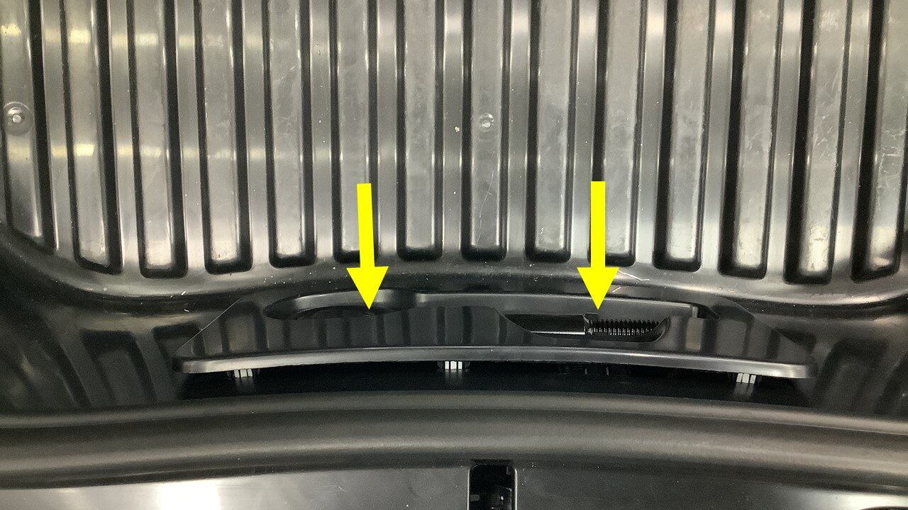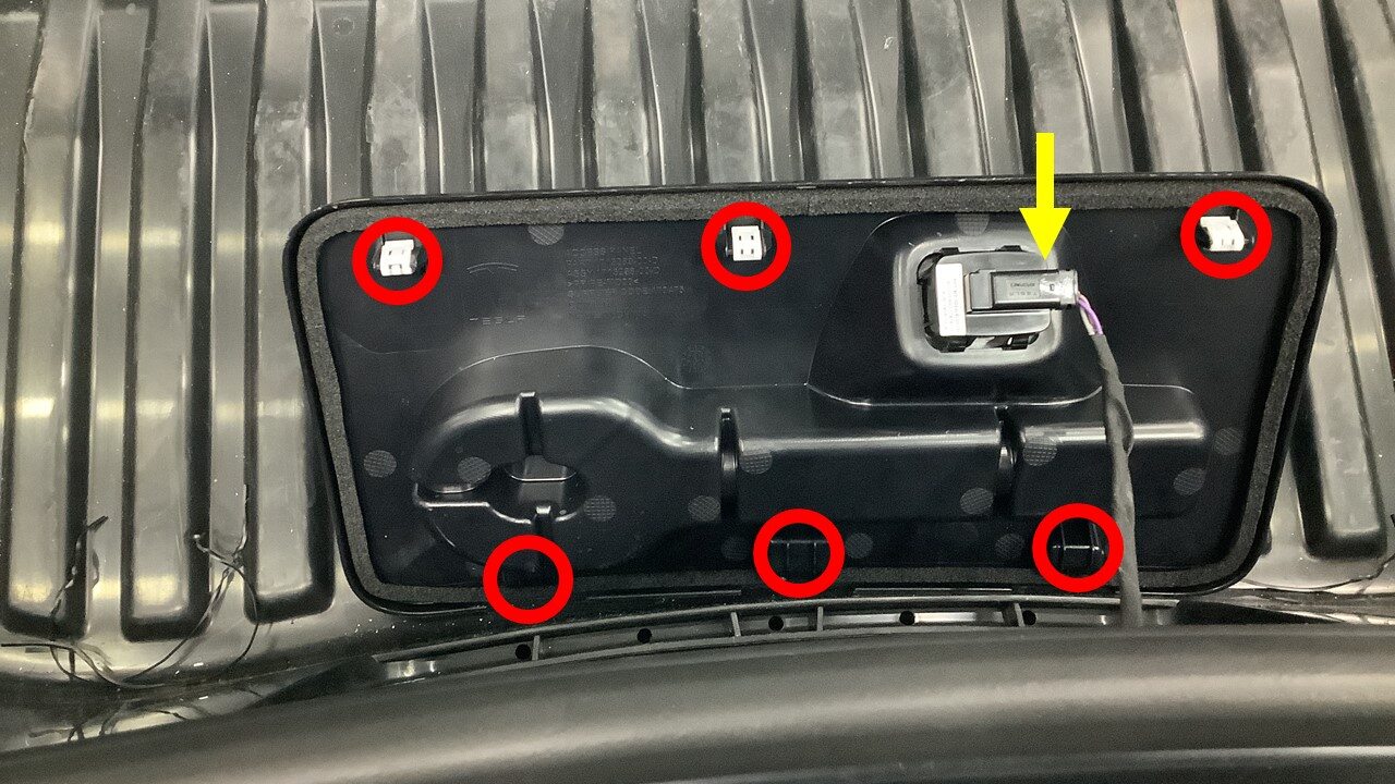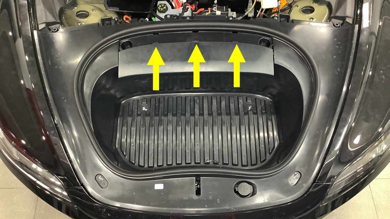 注3x clips, 1x connector, Frunk safety switch, 3x guide tabs, Align 3x tabs then push forward to secure clips.