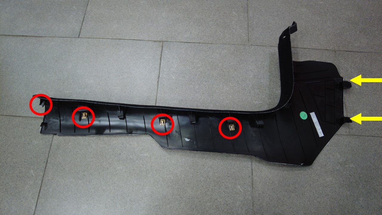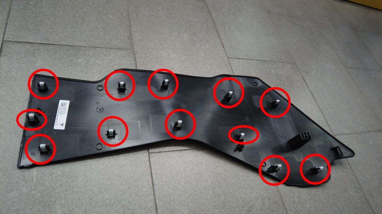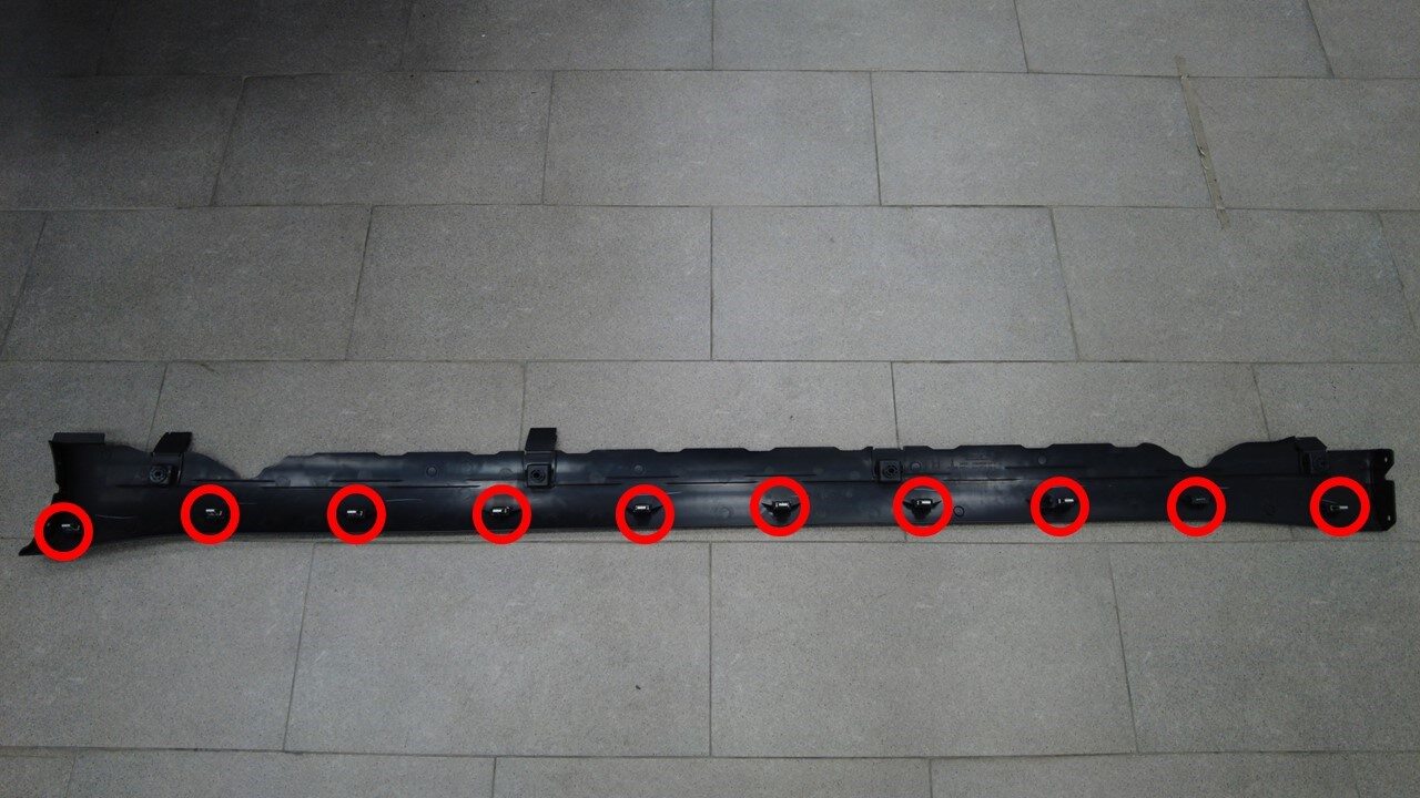 注12x clips, 2x positioning clips, 1x datum, Use trim tool starting at rear edge to release upper clips, If the clip is too tight, Useprytool to remove the clips, Then pull bottom to release remaining clips, Finally, release the datum and pull out the side panel backward, Replace the clips if it is damaged.