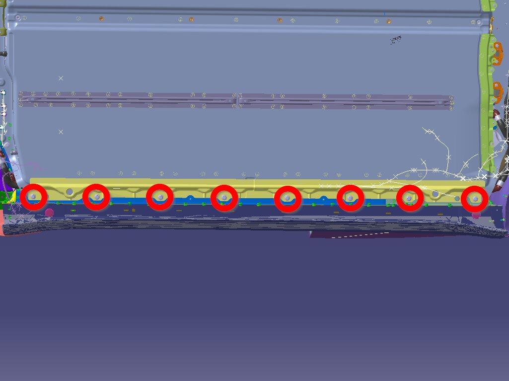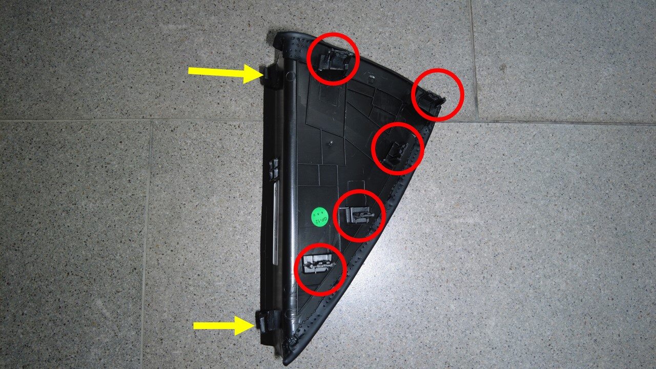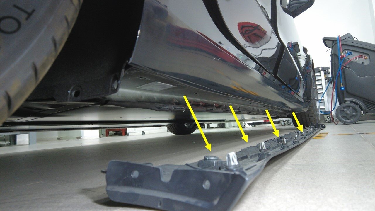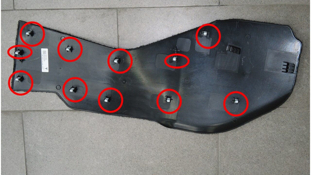 注12x clips, 2x positioning clips, 1x datum, Use trim tool starting at rear edge to release upper clips, If the clip is too tight, Useprytool to remove the clips, Then pull bottom to release remaining clips, Finally, release the datum and pull out the side panel backward, Replace the clips if it is damaged.